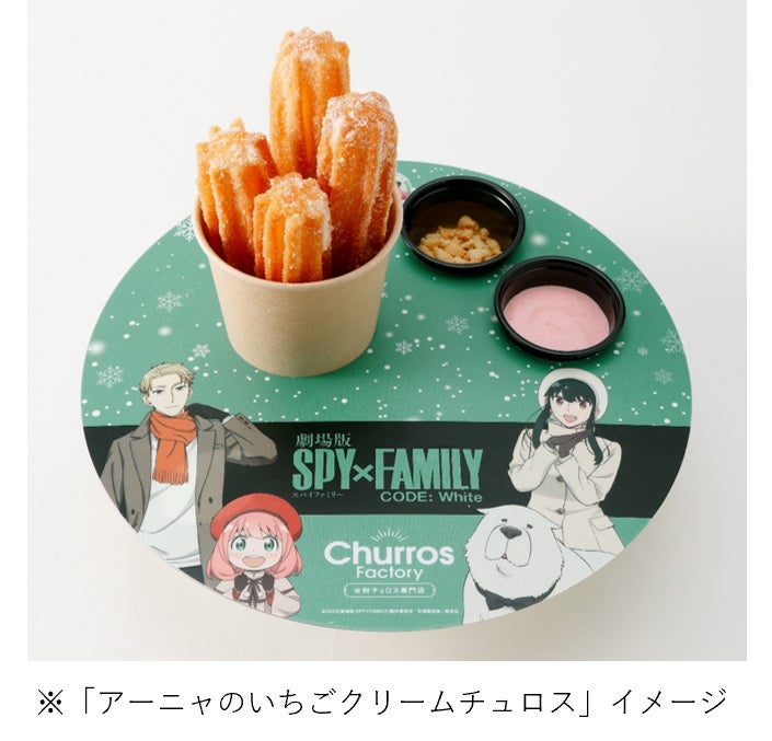 映画に登場するキャラクターのうち、ロイド・アーニャ・ヨル・ボンドをイメージしたディップチュロスをご用意。 Churros Factoryこだわりのチュロスと一緒に、オリジナル絵柄が入ったトレーでご提供いたします。
