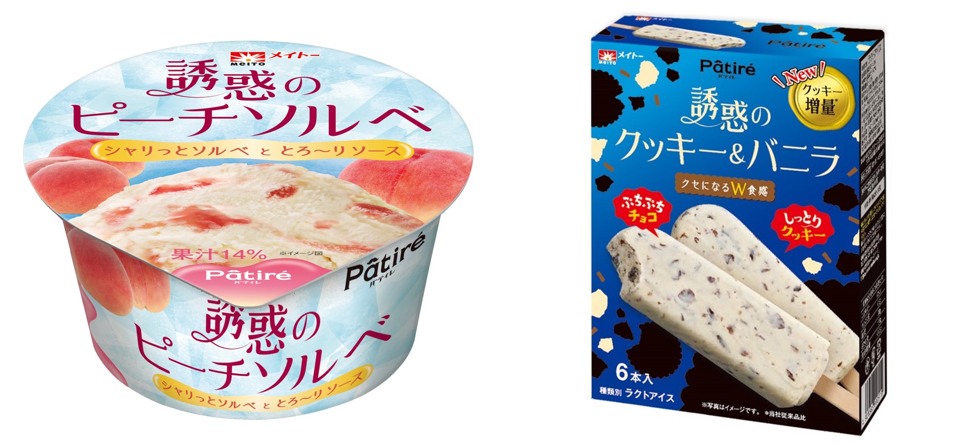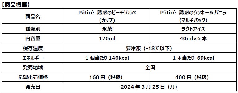 2024年3月25日(月)より全国のスーパーにて発売開始 桃の甘みがとろ~り『Pâtiré(パティレ)誘惑のピーチソルベ』 ぷちぷち食感が楽しい『Pâtiré(パティレ)誘惑のクッキー&バニラ』