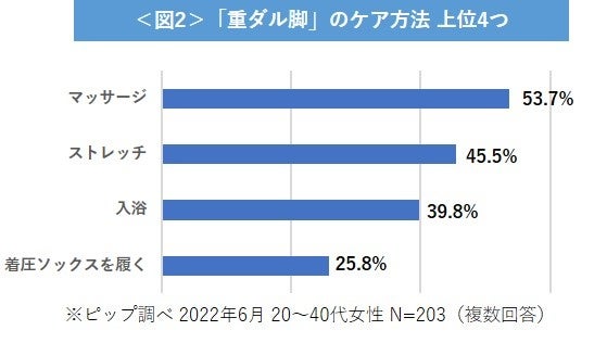 ▶具体的なケア方法としては、「マッサージ(53.7%)」が最も多く、その他、「ストレッチ(45.5%)」「入浴(39.8%)」「着圧ソックスを履く(25.8%)」が上位にランクイン。
