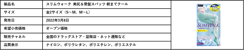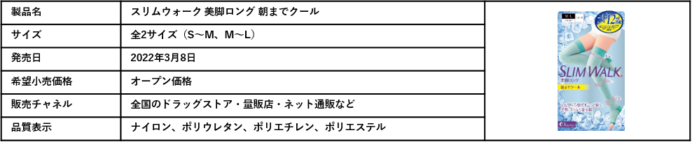 雨などで湿度の高い日は体から水分が蒸発しにくくなり、水分代謝が滞ることで重ダル脚になりやすいとされています。夏は多湿に加え、冷たい飲み物による体の冷えなどからも「重ダル脚」になりやすいため、「マッサージ」や「ストレッチ」等、自分に合ったケア方法を知っておくことが大切です。じめじめ暑くなるこれからの時期、着圧アイテムを使ったケアについては、ひんやり冷感が感じられるクールタイプの製品の使用がおすすめです。スリムウォークの朝までクールシリーズは、-4℃の冷感が12時間※持続する冷感設計で、暑い日も翌朝まで快適に「重ダル脚」をケアしていただけます。
