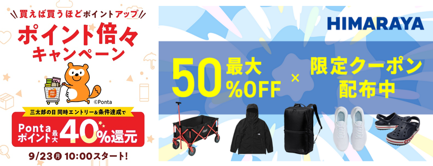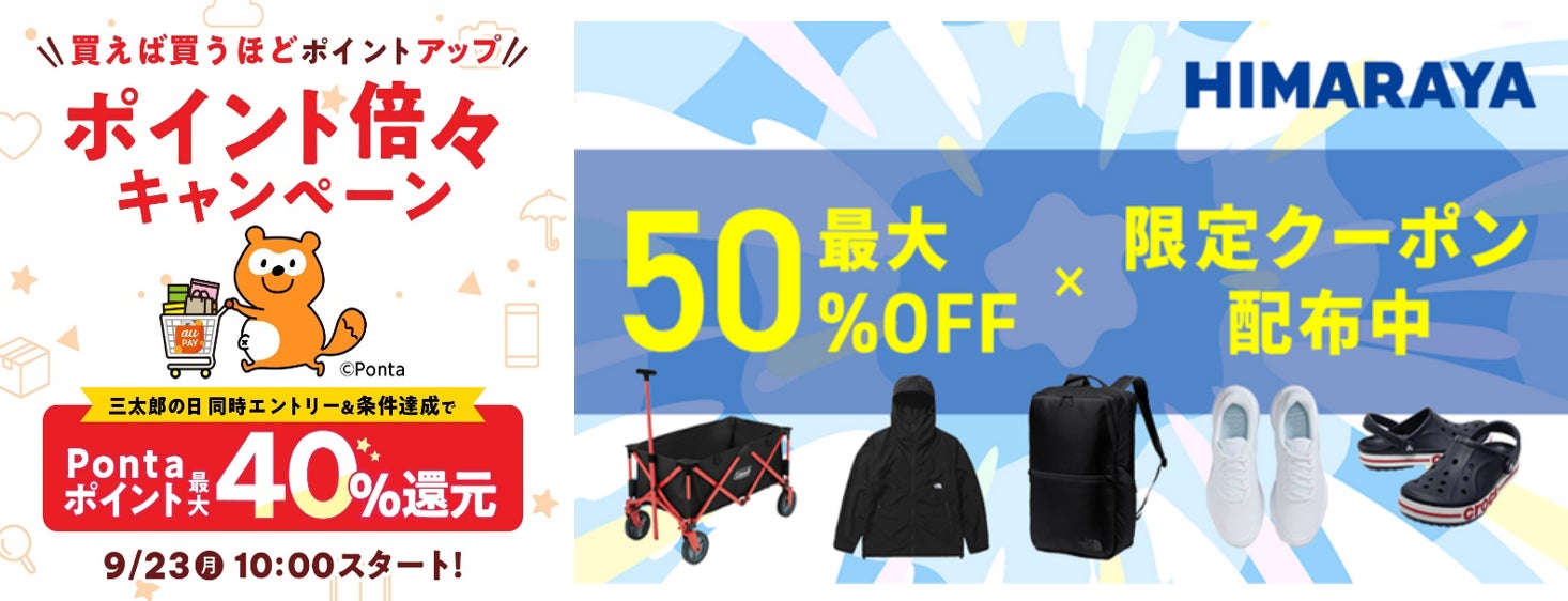 さらに、アウトドアブランドを取り扱う「ヒマラヤ アウトドア専門店」において、スポーツの秋に大活躍するNIKEやTHE NORTH FACE、adidasなどの人気ブランド商品が最大50%割引でご購入いただける割引セールや最大10%のポイント還元、割引クーポンのおトクなセールを開催します。