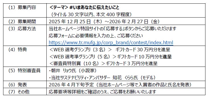 三菱UFJ信託銀行株式会社(取締役社長 窪田(くぼた) 博(ひろし)、以下 三菱UFJ信託銀行)は、2025年12月25日から2026年2月27日までの期間、「#いまあなたに伝えたいこと」をテーマとしたエッセイコンテスト(以下 本コンテスト)を開催いたします。