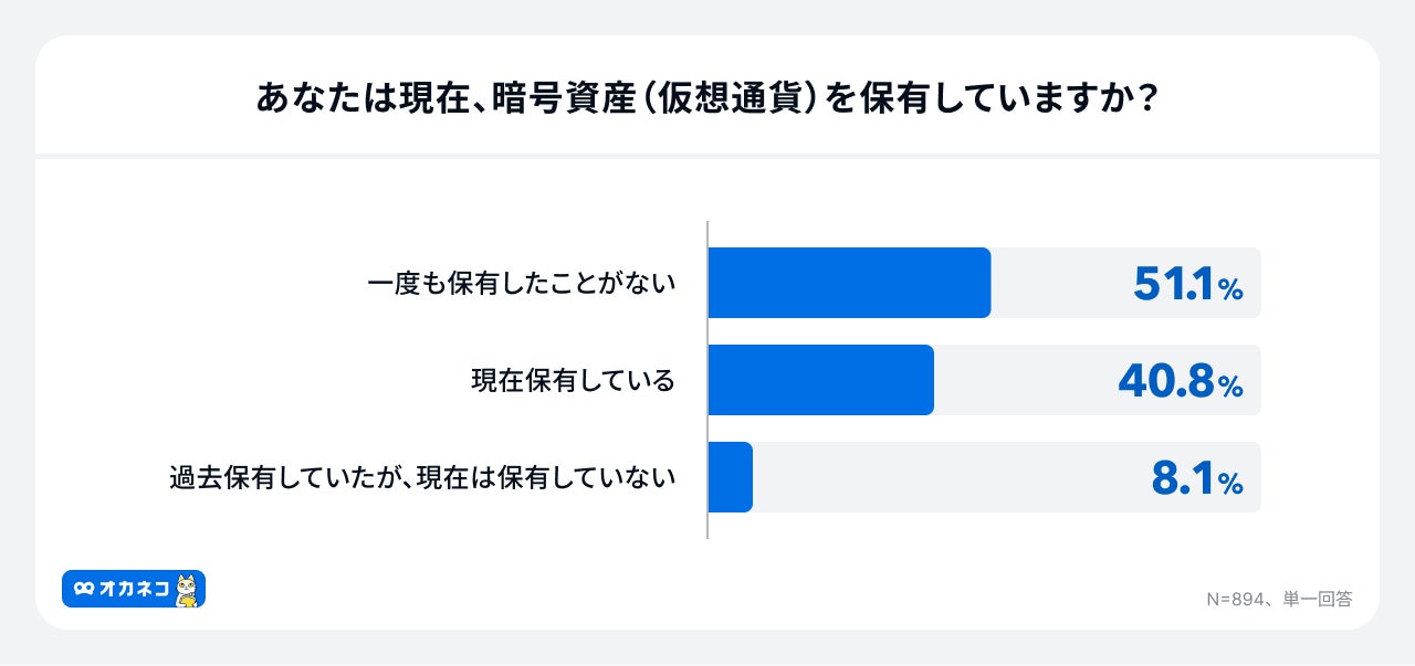 家計診断・相談サービス『オカネコ』を運営する株式会社400F(フォーハンドレッド・エフ、本社:東京都中央区、代表取締役社長CEO:中村 仁、以下「当社」)は、全国の『オカネコ』ユーザー894人を対象に「オカネコ 暗号資産に関する調査」を実施しました。
