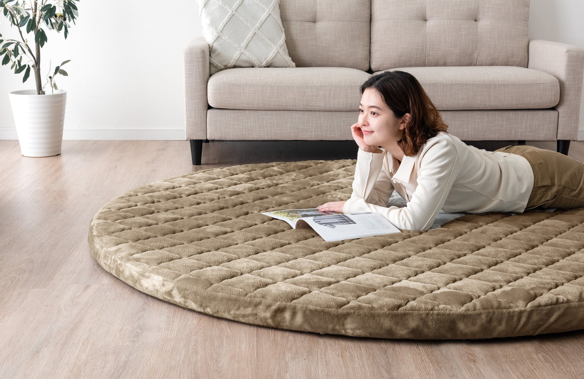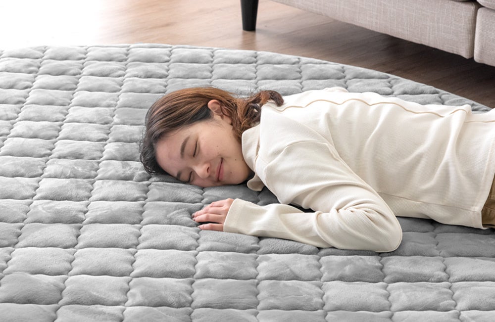 今回登場した2種類の円形極厚ラグは滑り止めを施しており、ラグに座ってソファに寄りかかった場合やお子様が走り回った場合にもズレを防ぐことができます。さらに、低ホルムアルデヒドで肌が敏感な方やお子様がいるご家庭でも安心してご使用いただけます。