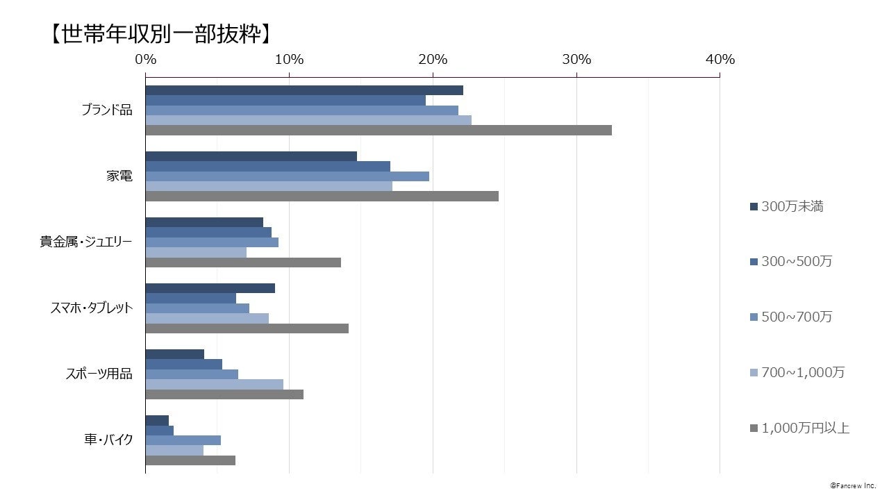 2.直近1年間で売却・出品した商品ジャンルは「洋服・ファッション」が60%で最多。世帯別に見ると、「ブランド」「家電」「貴金属・ジュエリー」等において、特に世帯年収1,000万円以上の利用が多い傾向にある。