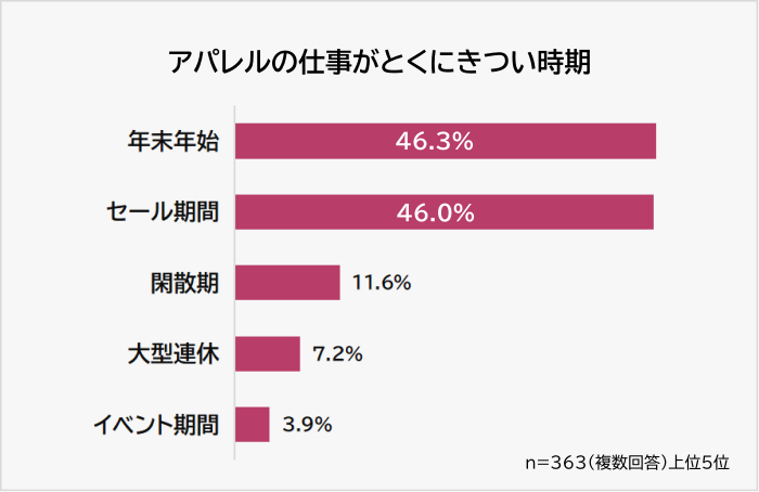 アパレルの仕事がとくにきつい時期の1位は「年末年始(46.3%)」。僅差の2位は「セール期間(46.0%)」でした。