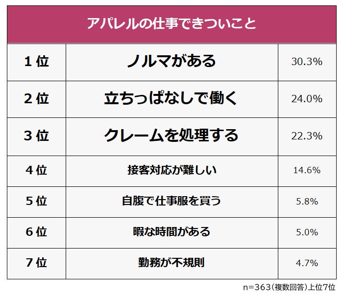 アパレルの仕事をしたことがある363人に「アパレルの仕事できついこと」を聞いたところ、1位は「ノルマがある(30.3%)」でした。2位「立ちっぱなしで働く(24.0%)」、3位「クレームを処理する(22.3%)」が続きます。