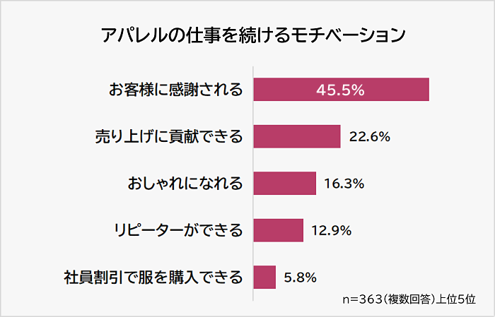 アパレルの仕事を続けるモチベーションの圧倒的1位は「お客様に感謝される(45.5%)」でした。