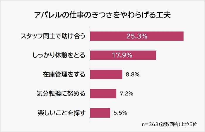 「アパレルの仕事のきつさをやわらげる工夫」を聞いたところ、1位は「スタッフ同士で助け合う(25.3%)」、2位は「しっかり休憩をとる(17.9%)」でした。