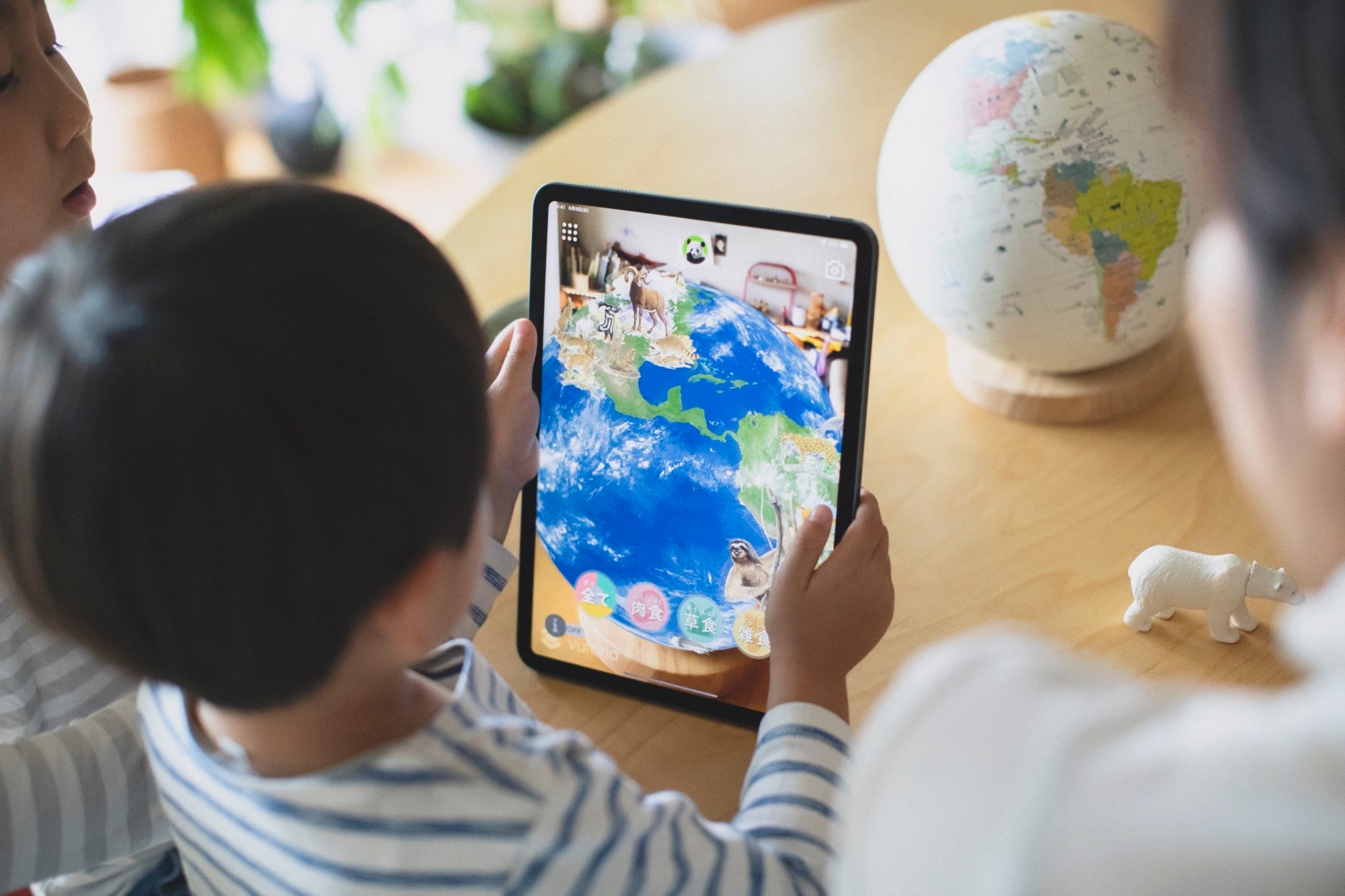 「ほぼ日のアースボール」は、タブレットやスマートフォンで専用アプリをかざすと世界のさまざまな情報がとびだす最先端の地球儀です。アプリで見られるARコンテンツは20種類以上。世界の国々の情報から、リアルタイムに変化する世界の気象や時刻、世界の動物や恐竜、世界遺産まで、多様なコンテンツラインナップで、お子さまへのプレゼントはもちろん、大人もたのしめる地球儀として好評いただいています。