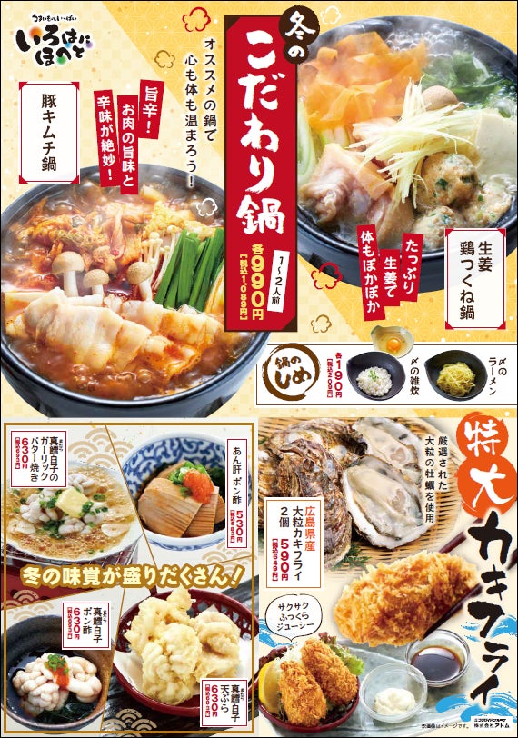 コロワイドグループの株式会社アトム(本社:神奈川県横浜市、代表取締役社長:山角豪)は居酒屋「いろはにほへと」にて、2022年11月7日(月)から店内飲食で楽しめる新しいコースと冬の味覚の提供を開始致します。