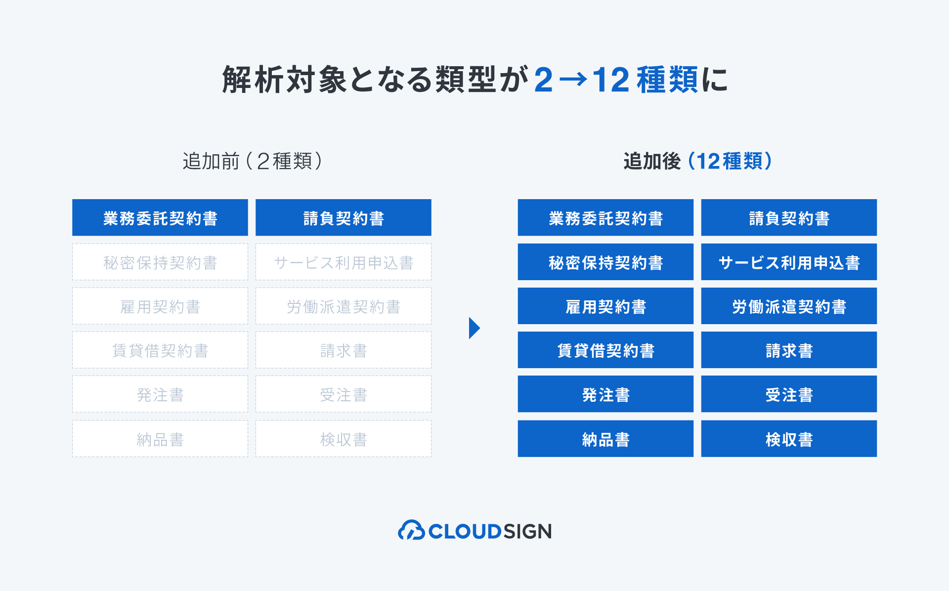 『AI契約書管理』ではこれまで、解析の対象となる契約書が「業務委託契約」と「請負契約書」の2種類となっておりましたが、この度、解析可能な契約書の種類を12種類まで拡充し、企業の幅広いビジネスシーンにおいて本機能を活用することが可能となりました。