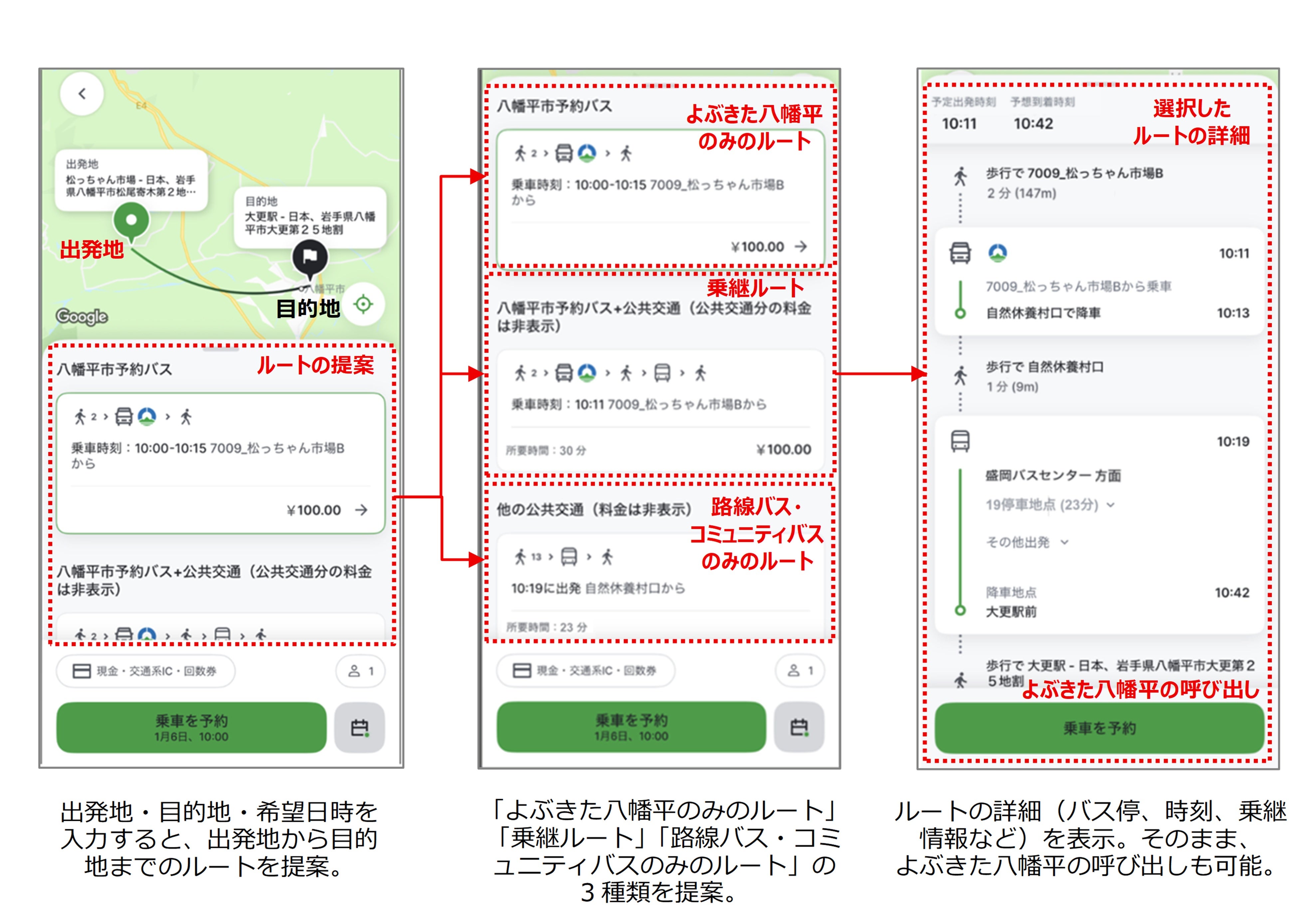 利用者は、出発地・目的地・希望時間を入力することで、
