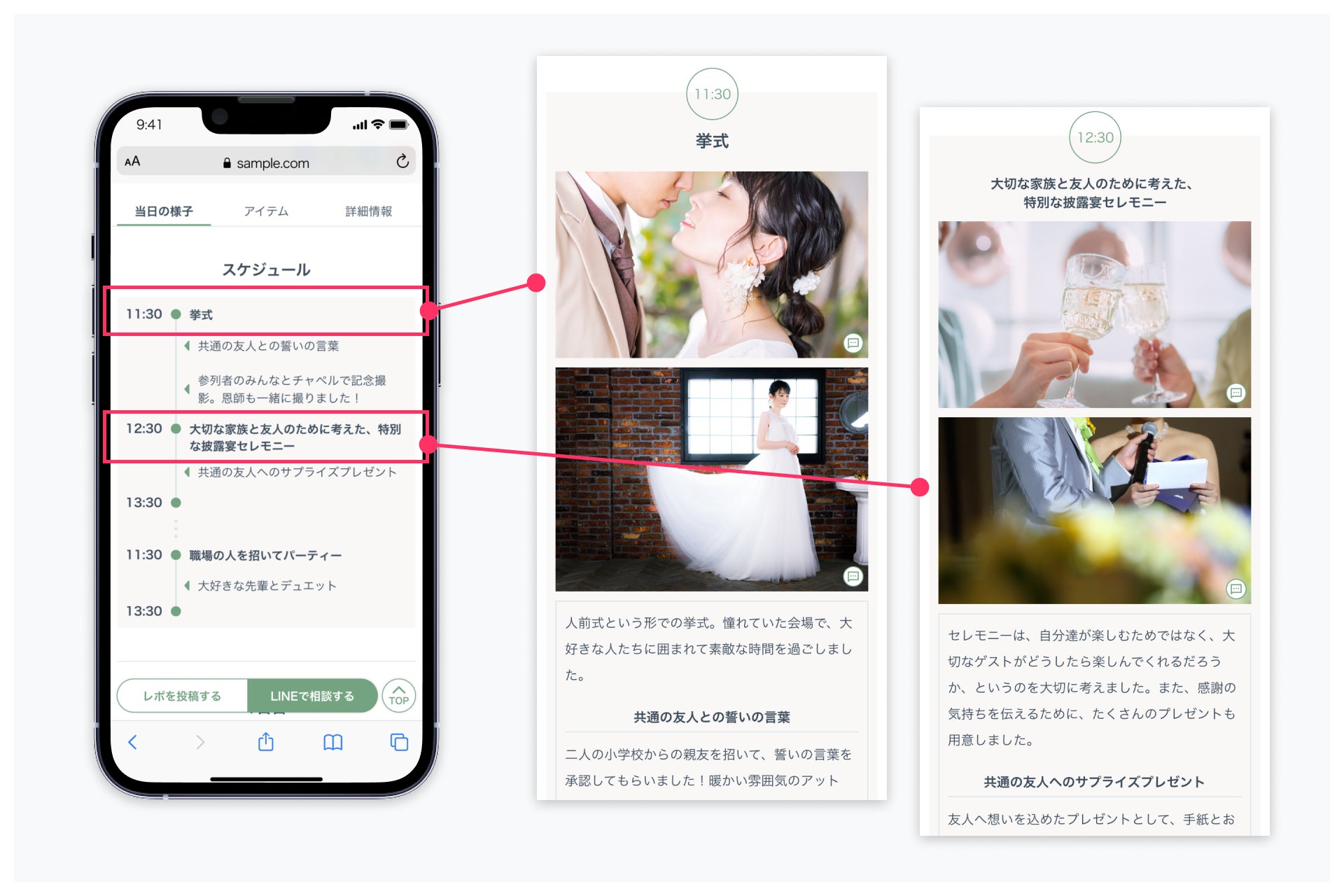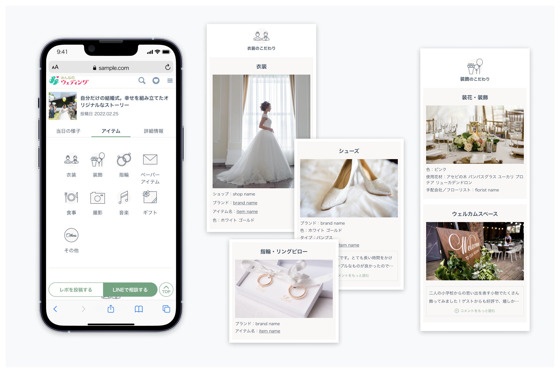 この度の本格リリースでは、結婚式やフォトウェディング当日の様子を臨場感のあるストーリー形式で掲載し、衣装、装飾など使用アイテムのブランド名やショップ情報なども詳細に紹介する内容へと、コンテンツを大幅に拡充しました。結婚式当日の様子や費用感を明確にすることで、後悔のない結婚式づくりに繋げていただくことを目指しています。