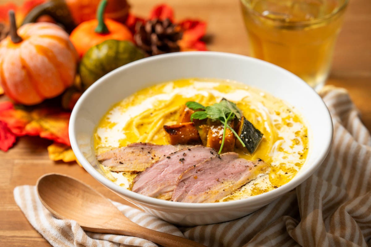 10月限定麺「ほくほくパンプキンヌードル」は、たっぷりのかぼちゃをポタージュに仕立てた濃厚スープがベース。かぼちゃの自然な甘みにクリームソースを重ねることで、まろやかさと深みのある味わいを実現しました。具材には、バジルで香りづけしたジューシーな鴨肉をトッピング。さらに、粉チーズをまぶしてローストしたかぼちゃを添え、ほくほく感と香ばしいチーズの風味を楽しめます。秋の恵みを余すことなく閉じ込めた、贅沢な一杯です。
