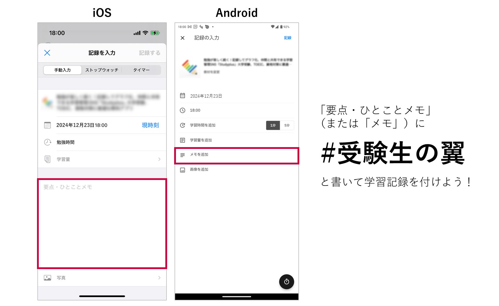 キャンペーン期間中(2024年12月23日(月)から2025年1月5日(日))に、"要点・ひとことメモ"(または”メモ”)にキーワード「#受験生の翼」を書いて学習記録を付けよう!