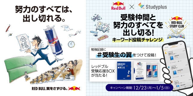 スタディプラス株式会社(本社:東京都千代田区、代表取締役:廣瀬高志、以下スタディプラス)は、レッドブル・ジャパン株式会社(本社:東京都港区、以下レッドブル)のレッドブル・エナジードリンクとのコラボキャンペーン企画「受験仲間と努力のすべてを出し切る!キーワード投稿チャレンジ」を、学習管理アプリ「Studyplus」上で大学受験生(高校3年生・浪人生)を対象に2024年12月23日(月)から2025年1月5日(日)までの期間限定で実施します。