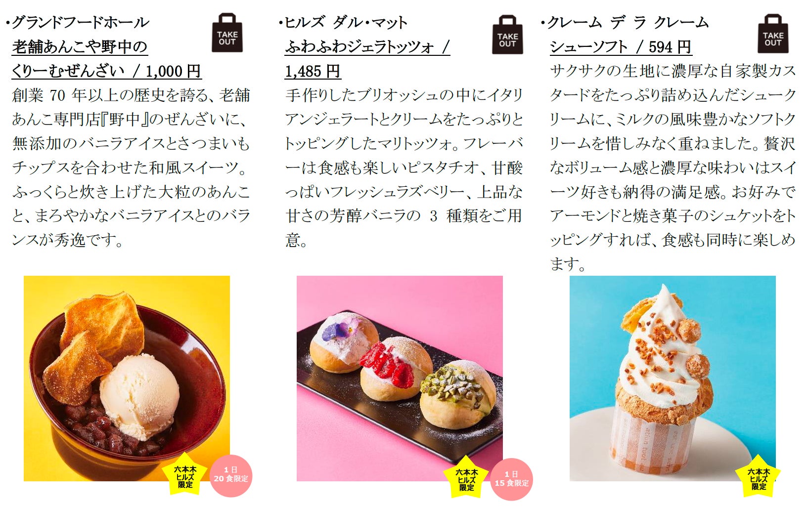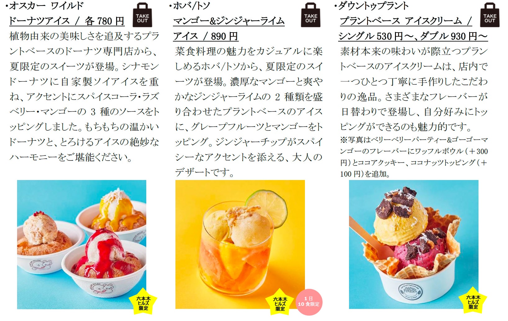 白桃コンポートとヨーグルトクリームが贅沢に入った、松也の「白桃ヨーグルトのかき氷」や、ラトリエ ドゥ ジョエル・ロブションではジョエル・ロブションで世界初の試みとなるかき氷「グラス ピレ マンゴー」を展開。その他、手作りのブリオッシュの中にイタリアンジェラートとクリームをたっぷりとトッピングしたヒルズ ダル・マットの「ふわふわジェラトッツォ」など、アイスが主役のひんやりスイーツをご用意しました。また、植物由来の素材のみを使用しながらも、濃厚なアイスともっちりドーナツを味わえるオスカー ワイルドの「ドーナツアイス」や、ダウントゥプラントの「プラントベース アイスクリーム」など、健康を気遣いながら美味しくいただけるプラントベースアイスクリームも登場。ジェラート専門店ならではの旬のフルーツを使用した、ジェラテリア ラッフィナートの「ジェラート3種盛りコーン」や、毛利サルヴァトーレ クオモの「トロピカルフルーツとショコラータのパルフェ」など、フルーツを贅沢に使ったひんやりスイーツはカラフルな見た目で夏らしさを演出します。テイクアウト可能な商品も多数ご用意しており、六本木ヒルズ内の毛利庭園など屋外でもお楽しみいただけます。