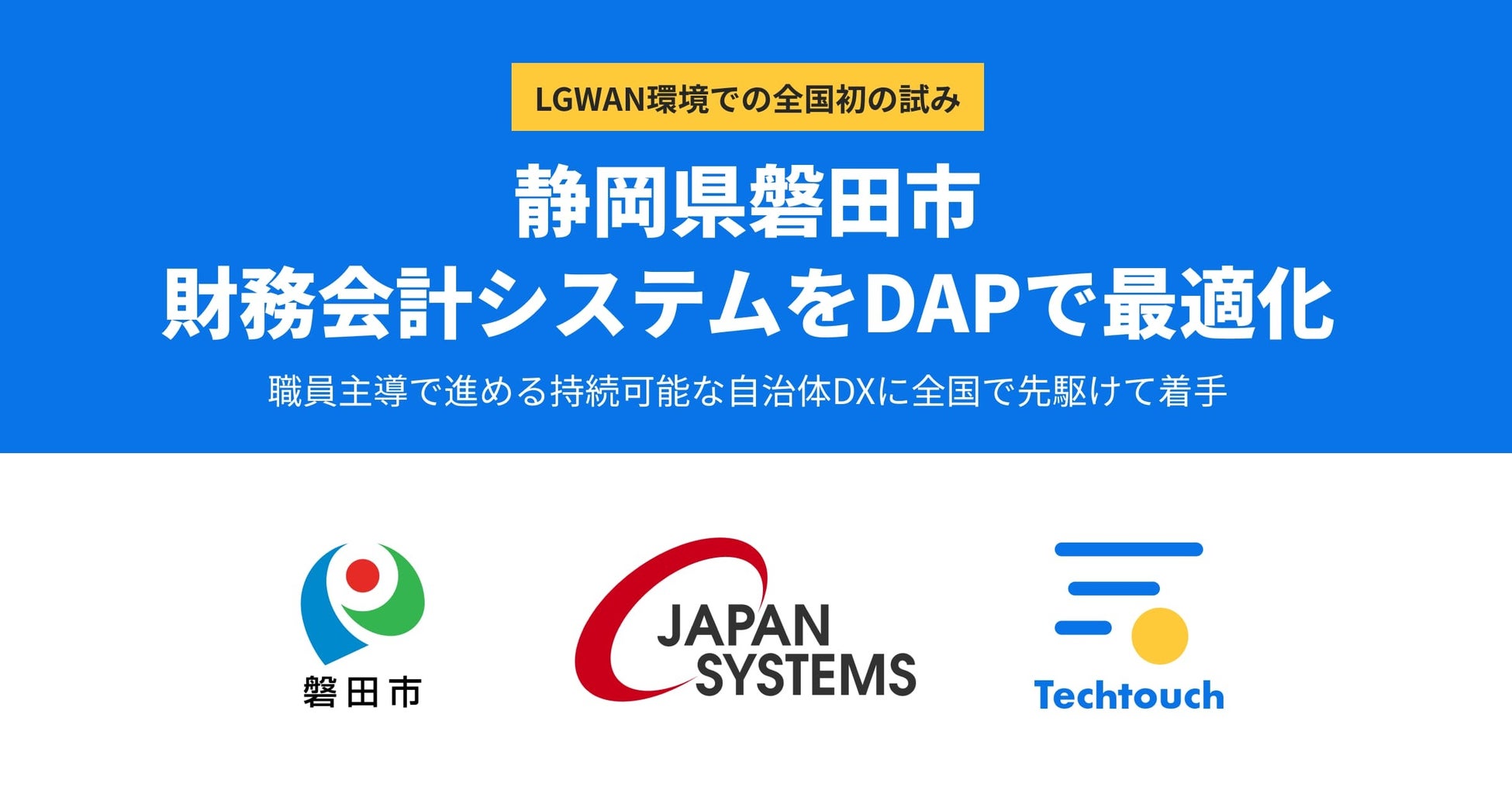 デジタルアダプションプラットフォーム(DAP)国内シェアNo.1の「テックタッチ」を開発・提供するテックタッチ株式会社は、静岡県磐田市(市長:草地 博昭、人口16.7万人)が導入したジャパンシステム株式会社の財務会計システム「FAST財務会計」に「テックタッチ」が採用されたことをお知らせします。