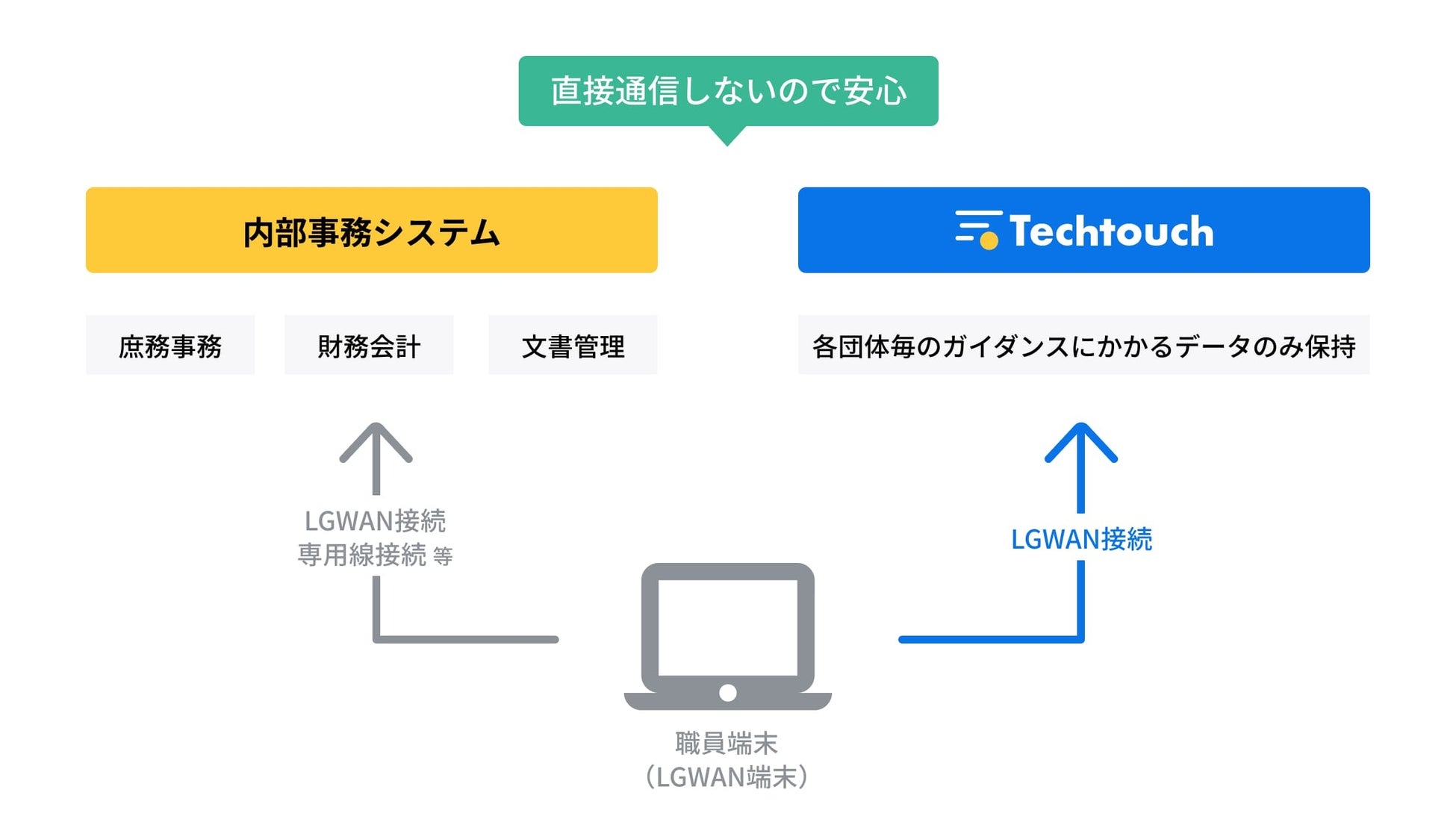 LGWANは、自治体が利用する閉域ネットワークです。この特殊な環境下でも、Webシステムにガイドやデザインパーツを簡単に追加できるDAPを提供するテックタッチは、国内で唯一のソリューション提供者です。DAPは財務会計システムを含む庁内事務システムの利便性を大幅に向上させることができます。