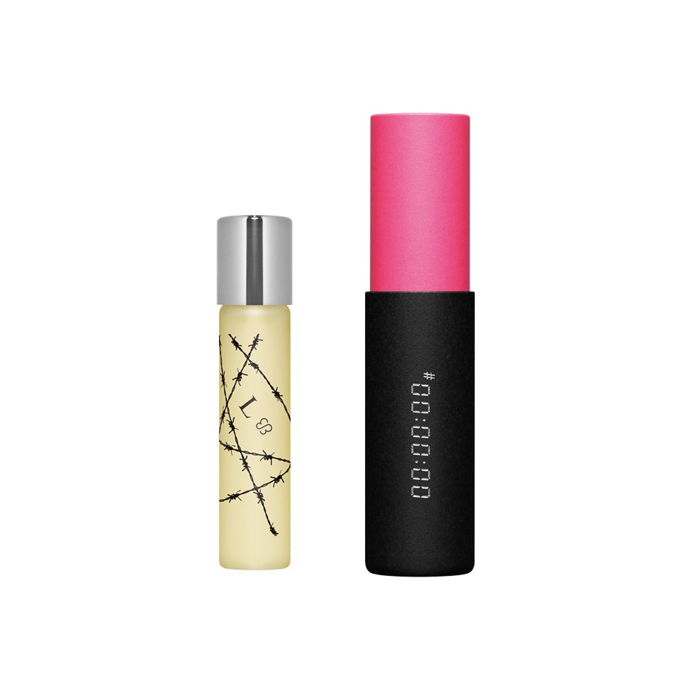 パッケージの数字は、黒色を16進数で表したもの。黒は#000000になるため、ukaの時刻表現と当てはめ#00:00:00としています。内筒はLIMI feuのショッパーと同色の蛍光ピンクに、ボトルにはテキスタイルで使用した有刺鉄線のモチーフを印刷し、ネイルオイルのキャップはシルバーで仕上げました。ブラックローズにインスパイアされて選ばれたのは、ローズ、ブラックペッパー、ジャスミン、イランイランをブレンドした香り。 LIMI feuのディスクリプションと同じように、付ける人の個性と溶け合う余白を残します。
