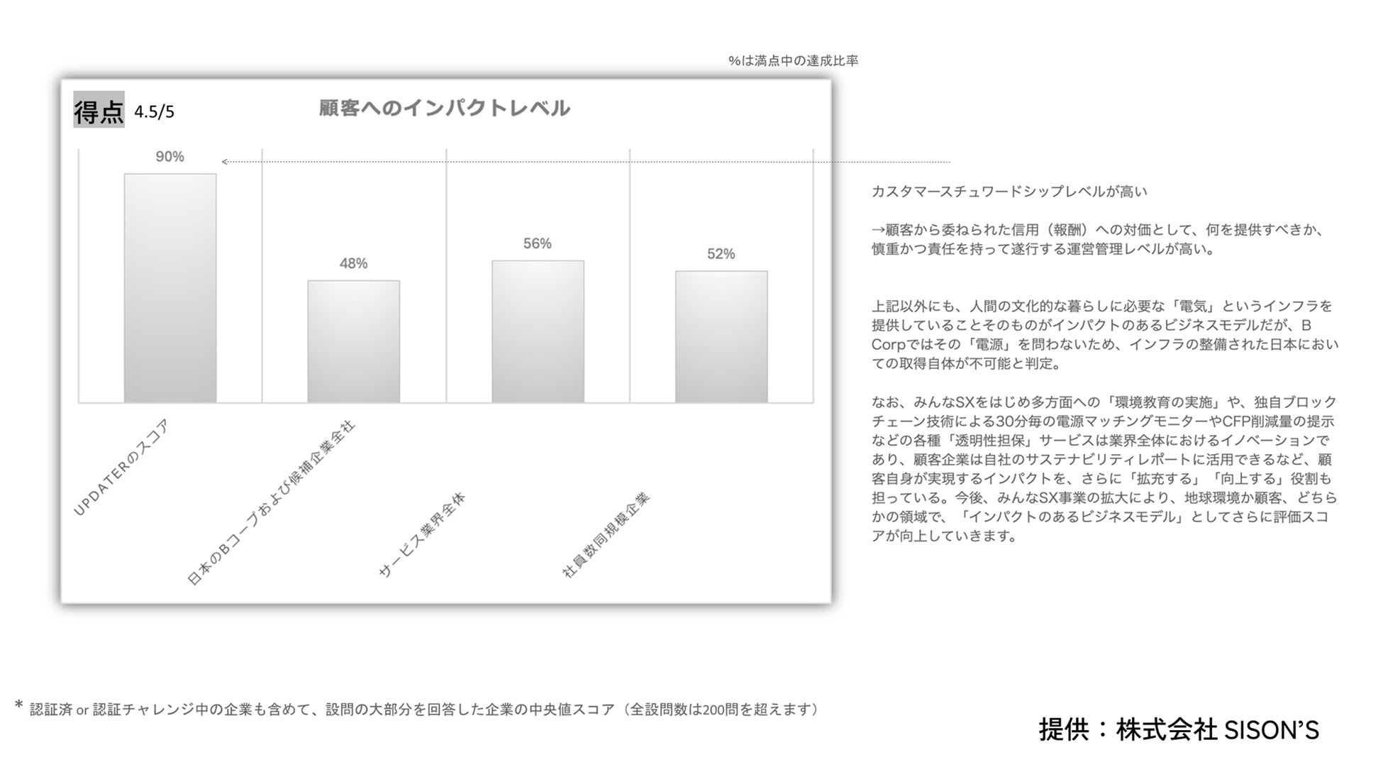顧客領域では、企業が提供する製品やサービスが顧客にどのような価値を生み、信頼や透明性をどのように担保しているかが評価されます。UPDATERの特徴は以下の通りです。
