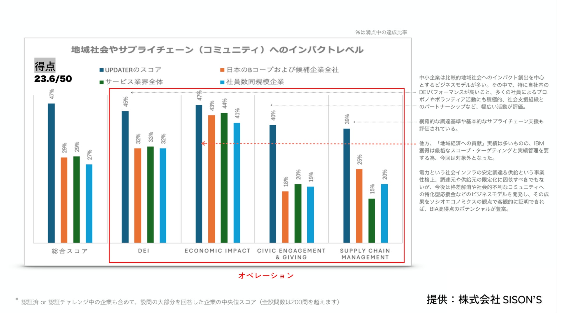 コミュニティ領域では、地域社会やサプライチェーンに対して、事業の「中核的」な活動を通して、経済的にどれほど関与・貢献しているかが評価されます。UPDATERの特徴は以下の通りです。