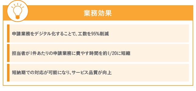 申請業務をデジタル化することで工数を95%削減したほか、短納期での対応が可能となり、サービス品質向上も実現