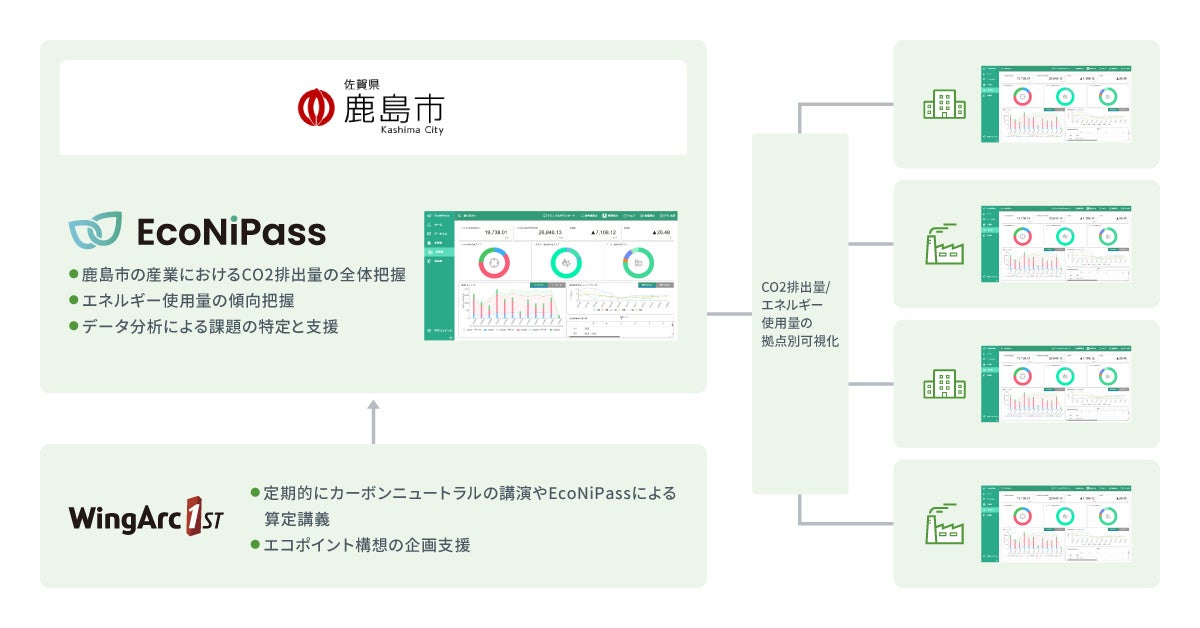 ウイングアーク1st株式会社(本社:東京都港区、代表取締役 社長執行役員CEO:田中 潤、以下、ウイングアーク)は、SDGs未来都市の佐賀県鹿島市と連携し、鹿島市全域の公共施設および市内の企業向けに、CO2排出量可視化プラットフォーム「EcoNiPass」を無償提供することをお知らせします。