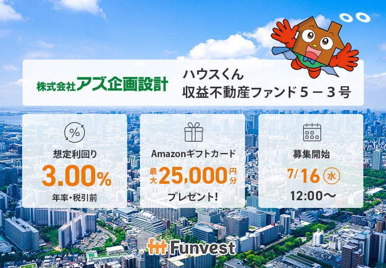 「未来をわかちあう投資」を提供する「Funvest(ファンベスト)」(以下、Funvest)は、「アズ企画設計 ハウスくん収益不動産ファンド5-3号」(以下、本ファンド)の募集を7/16より開始しますので、お知らせいたします。