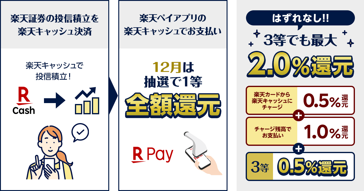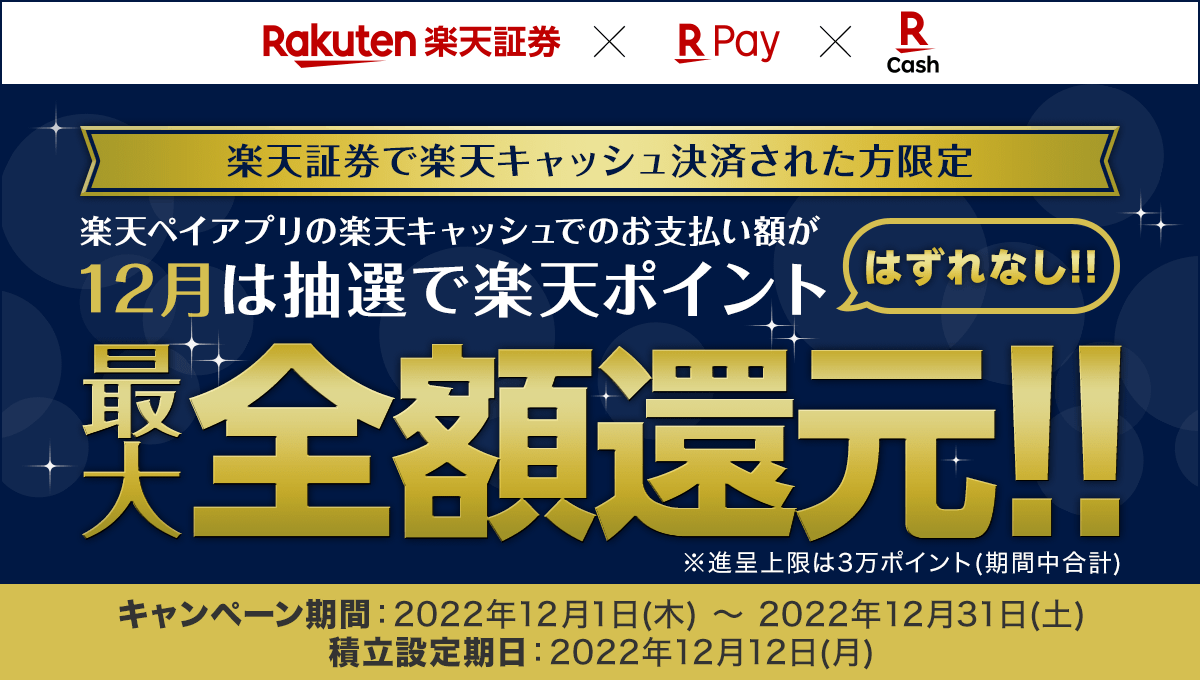 | キャンペーン期間 | ①「楽天キャッシュ」で投信積立 積立設定期日:2022年12月12日(月) 買付指定日:2023年1月1日(日)~2023年1月28日(土) ②「楽天ペイ」アプリで「楽天キャッシュ」のチャージ払いでの支払い 2022年12月1日(木) 0:00 ~ 2022年12月31日(土)23:59 |