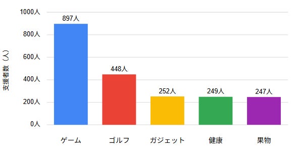 支援者数のデータが得られたジャンルについて平均支援者数を算出したところ、ゲームジャンルが平均897人と最も多く、次いでゴルフジャンルが平均448人、ガジェットジャンルが平均252人、健康ジャンルが平均249人、果物ジャンルが平均247人となりました。