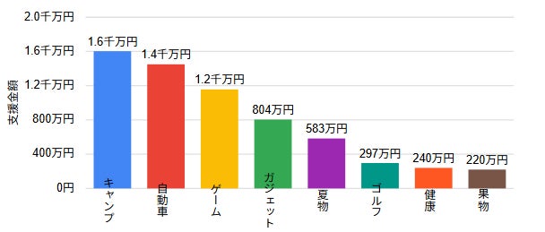平均支援総額が高いジャンル:キャンプ、自動車関連、ゲーム