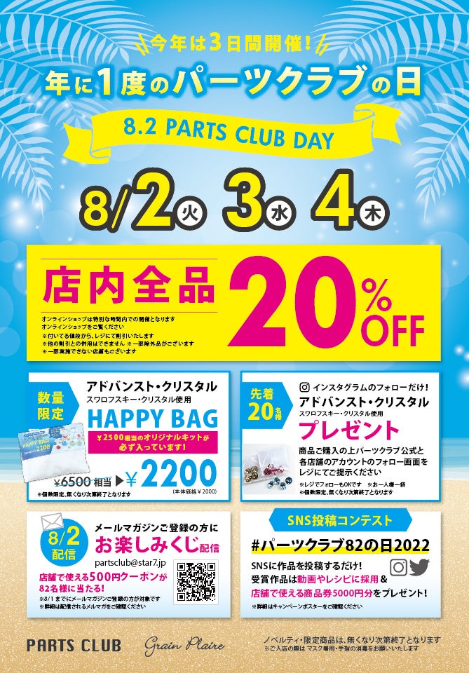 8月2日は「パーツクラブの日」ビーズ&パーツショップPARTS CLUB では年に一度の大感謝イベントを開催。2022年は初となる3日間開催!