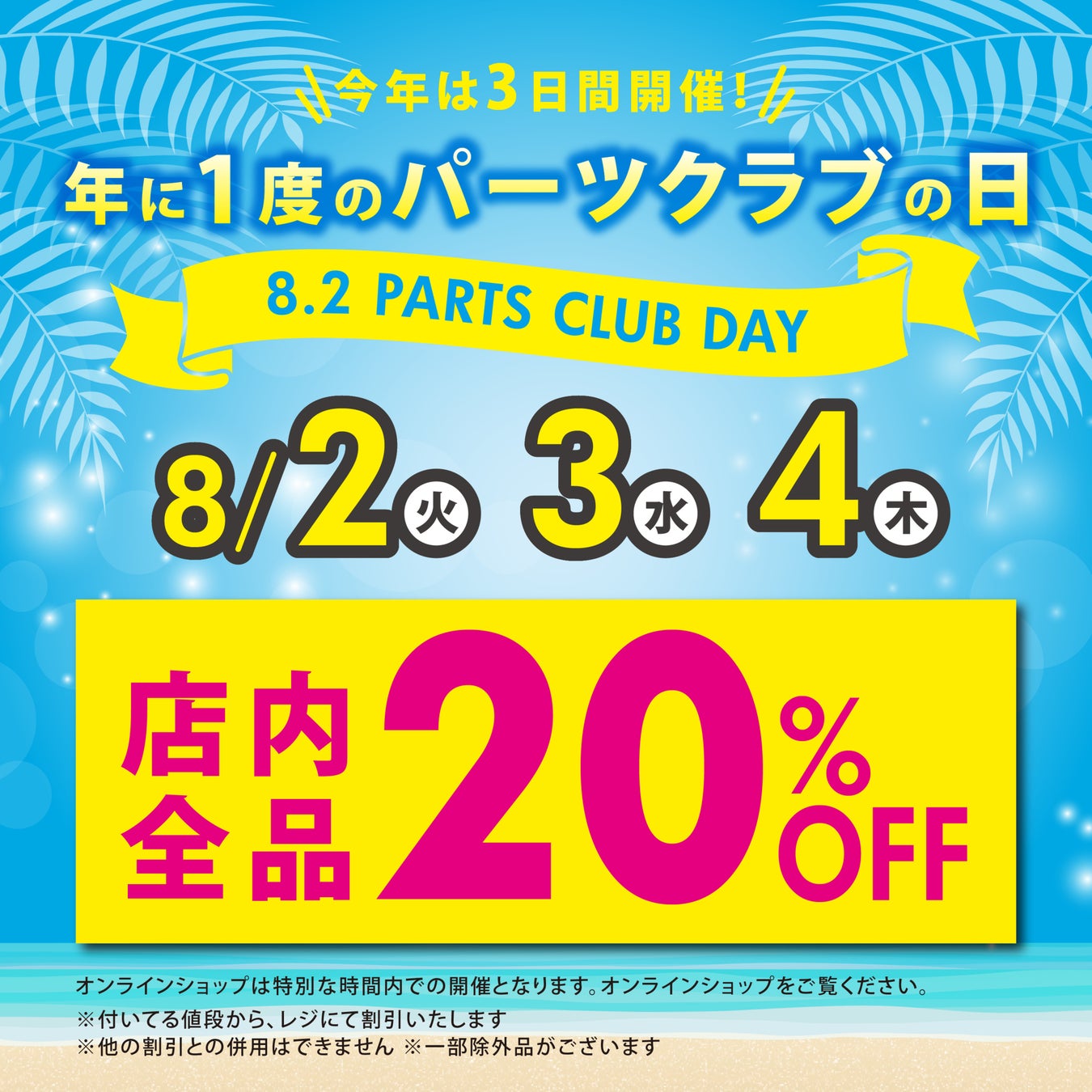 パーツクラブ店舗&オンラインショップでは、なんと店内全品が20%OFFとなるイベントが決定。