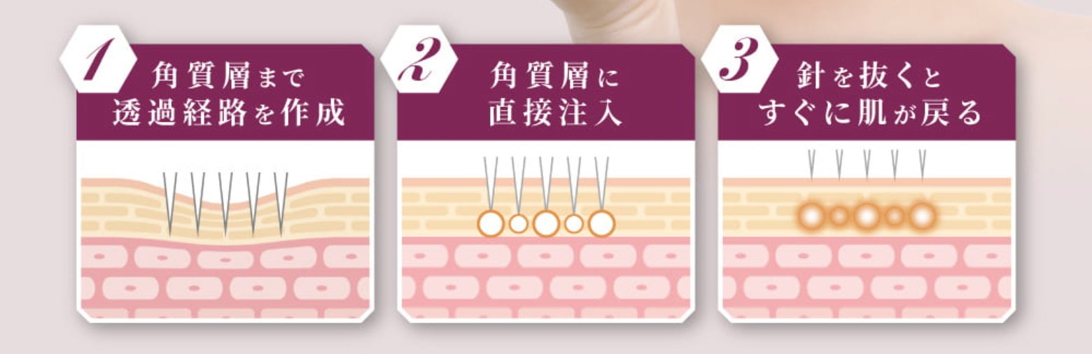 ビタミンC誘導体*2とナイアシン*3を注入するスキンケアで、200μmの極小ニードルでダイレクト注入*1。成分を直接届ける*1ニードル型美容となっています。