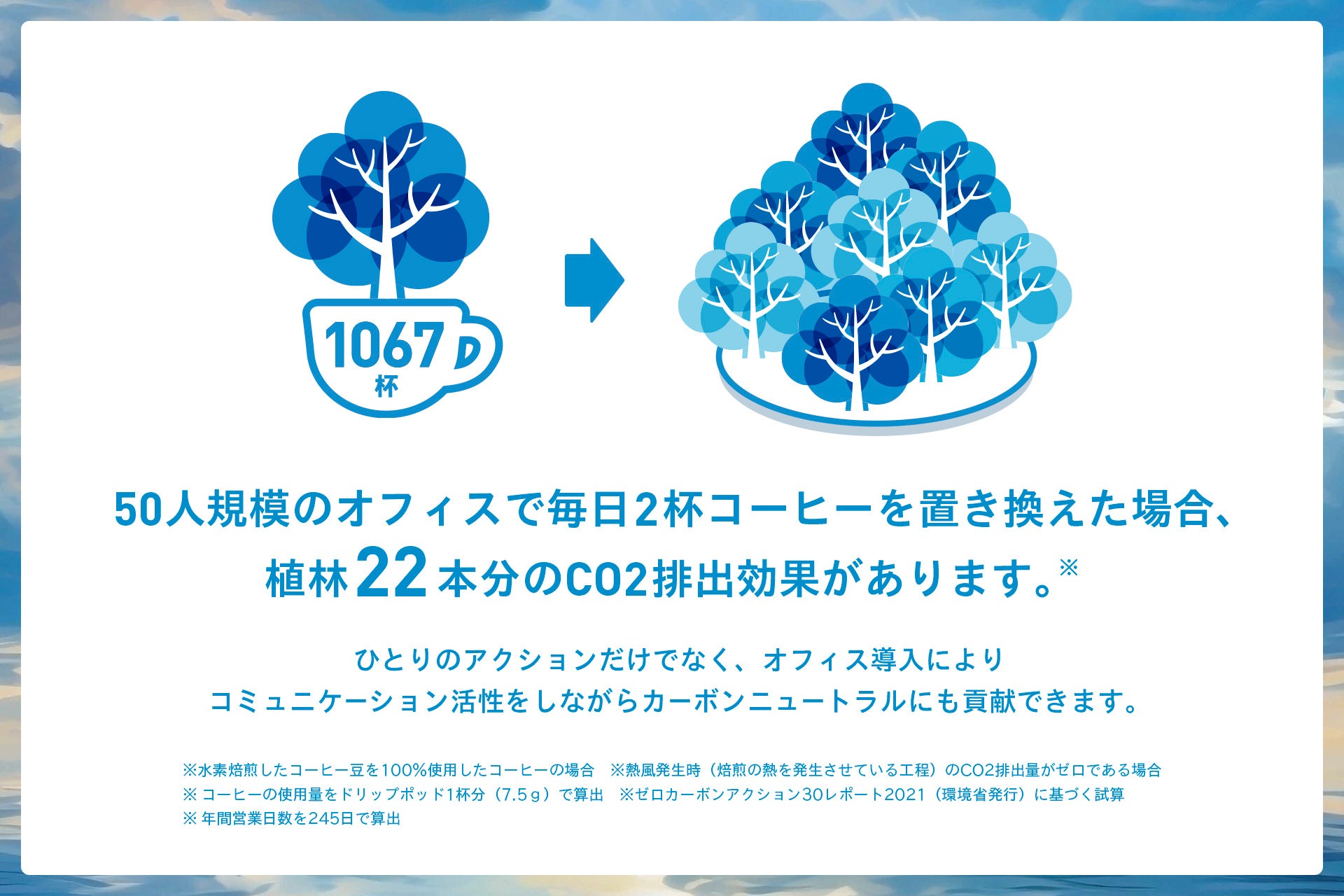 また、オフィスでのリラックスタイムやコミュニケーションタイム、気持ちを切り替えたいときなどに、シンプルな操作で手軽においしいコーヒーを楽しむことで、自然と脱炭素・カーボンニュートラルの実現にもつながります。例えば、50人規模のオフィスで、1人1日2杯、普段のコーヒーをドリップポッドの水素焙煎コーヒーに置き換えた場合、1,067杯で植樹1本分のCO2削減効果があり、さらに1年間では植林22本分に相当するCO2排出削減量となります※4。事業所規模で取り組みを行うことにより、個人のアクションにとどまらず、大きなムーブメントを生み出すことができます。