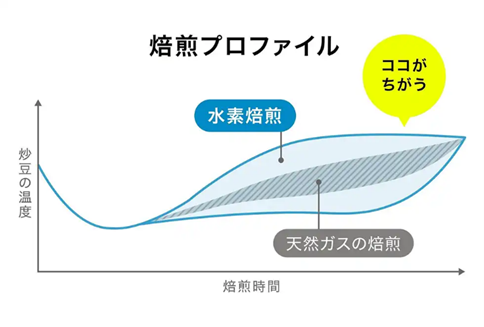 当初は従来熱源と同等の味覚を再現することを目指していましたが、開発が進むにつれ、既存熱源に比べ、焙煎時の温度調整幅が広いため、緻密なプロファイルコントロール技術と組み合わせることで、既存熱源よりも多彩な味覚形成が可能となるなど、水素焙煎独自の優位性を確認することができました。(※右図参照)