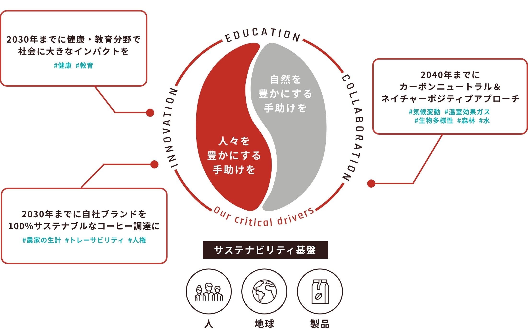 「より良い世界のために、コーヒーの力を解き放つ。」というパーパスのもと、2040年までのカーボンニュートラル実現やサステナブルなコーヒー調達の推進を掲げ、持続可能な社会の実現と事業成長を両立させる活動を加速させています。また、世界初の缶コーヒーの開発、教育機関「UCCコーヒーアカデミー」やコーヒーの知を継承・創造する「UCCコーヒー博物館」の運営、さらにコーヒーを“飲む”から“食べる”へ進化させた『YOINED』、世界初となる「水素焙煎コーヒー」の量産開始など、既存の枠にとらわれない独自の価値創造に挑戦し続けています。