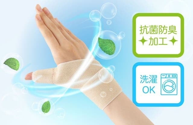 このサポーターは、親指にはめて巻くだけの簡単装着で、手首をしっかりとホールドします。信頼の日本製品で、品質にもこだわっています。抗菌防臭加工が施されており、吸水速乾性試験もクリアしているため、運動中や暑い季節でも蒸れにくく、清潔で快適に使用できます。