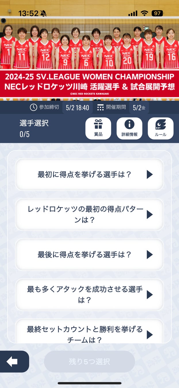 SVリーグ所属 NECレッドロケッツ川崎 5月2日(金)〜のチャンピオンシップ ファイナルの活躍選手&試合展開予想をスポーツ予想アプリ「なんドラ」で開催!