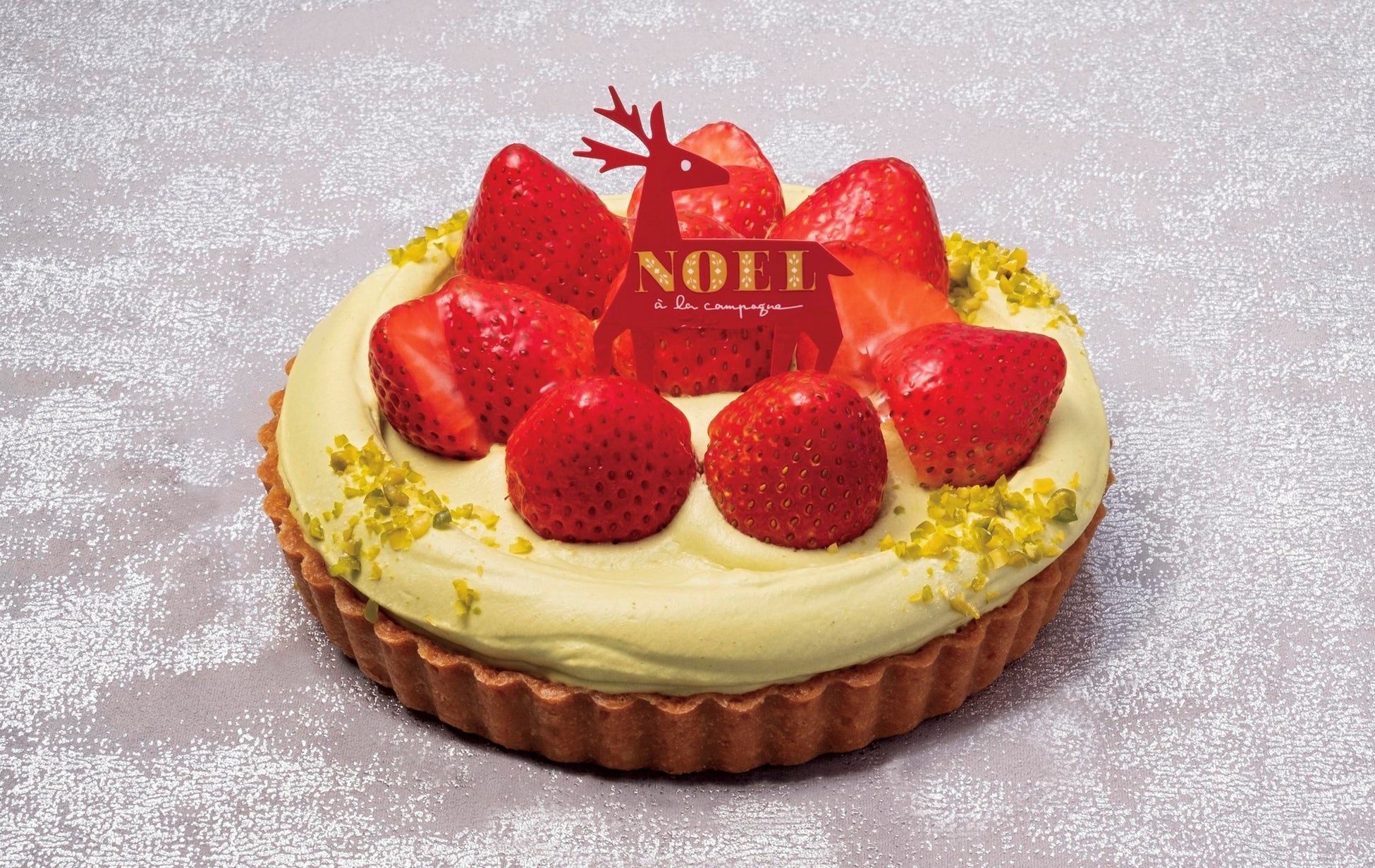 ピスタチオの淡い緑と真っ赤なイチゴのクリスマスカラーが可愛いタルト。やさしい味わいのピスタチオクリームにイチゴの酸味は相性抜群です。