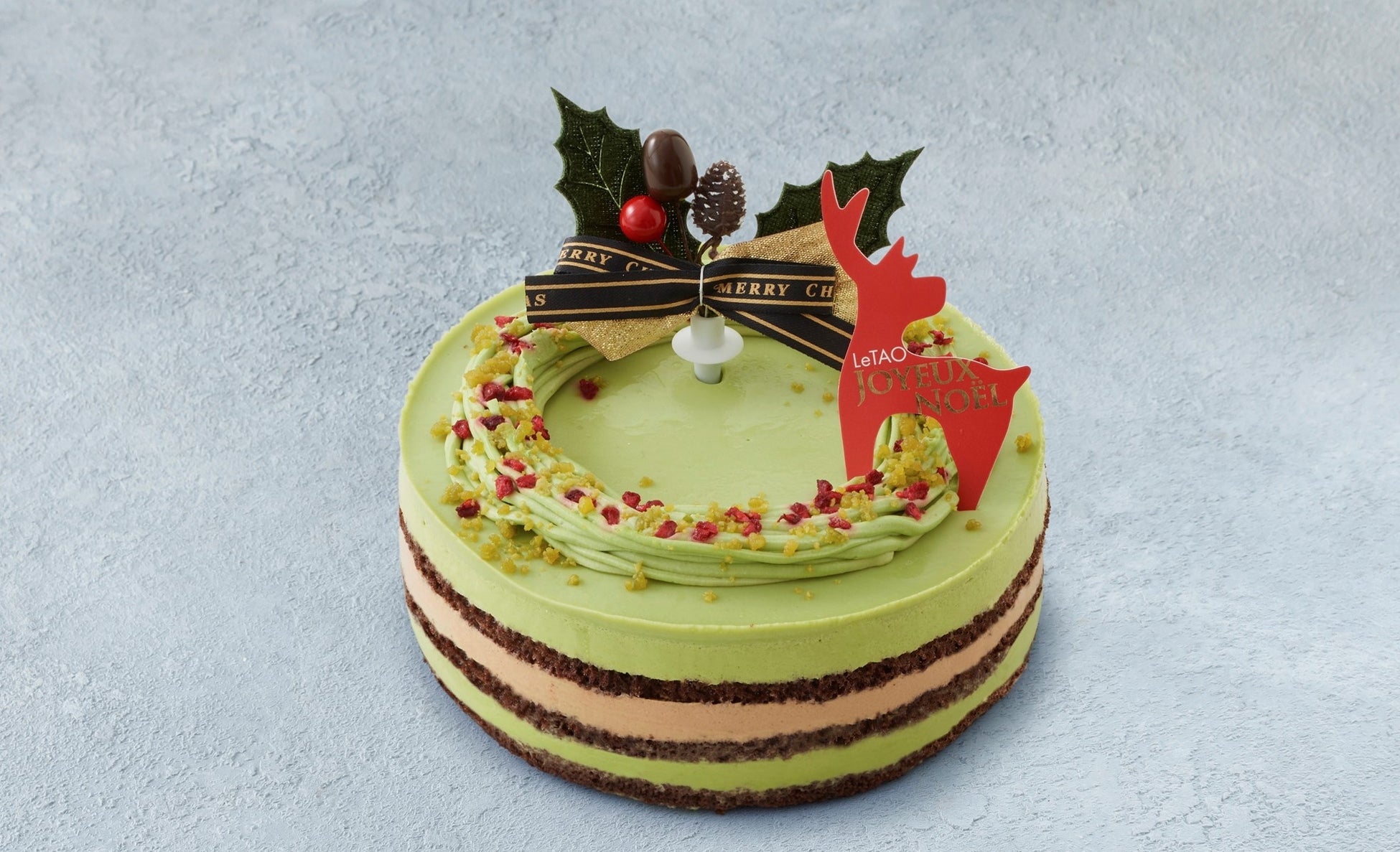 クリスマスリースのようにデコレーションしたピスタチオケーキ。味わいの異なる2種のピスタチオペーストを使い分けています。なめらかな口どけとピスタチオの芳醇な香りをお楽しみいただけます。
