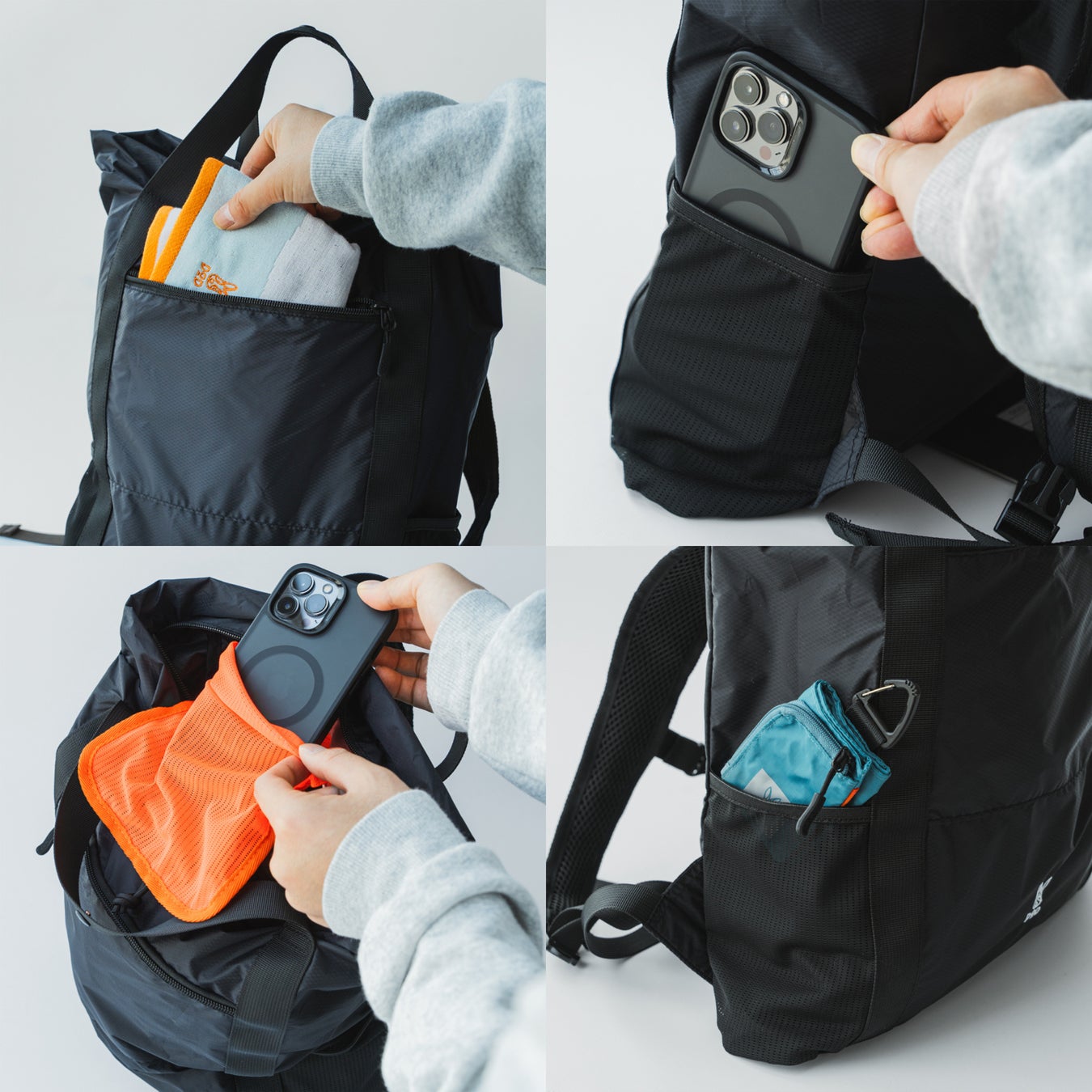 ・ポケサック:約220gで「背負っているのを忘れる」ほどの軽量リュック(約14L)。