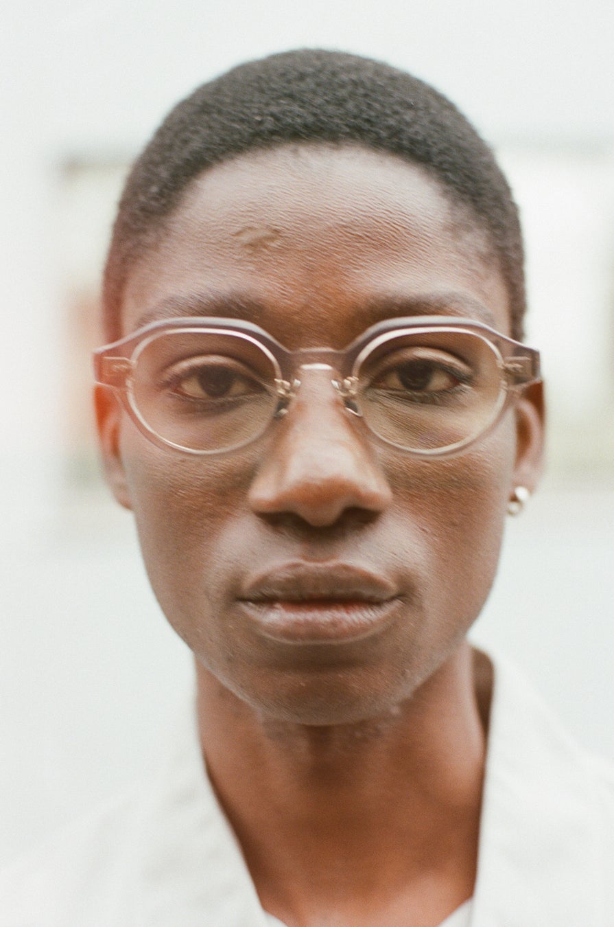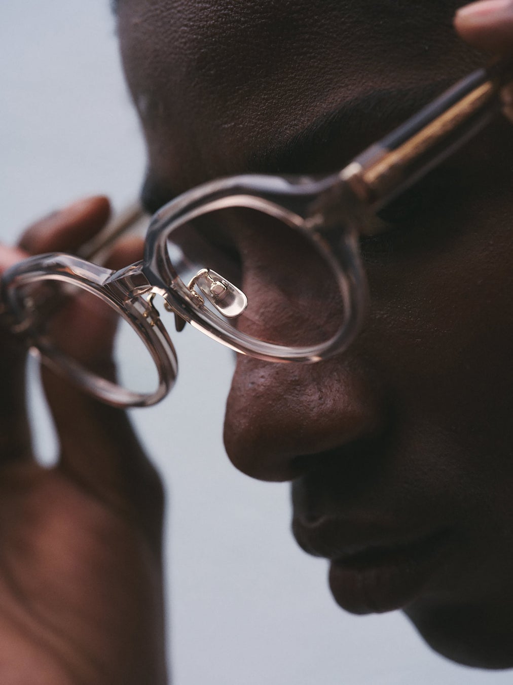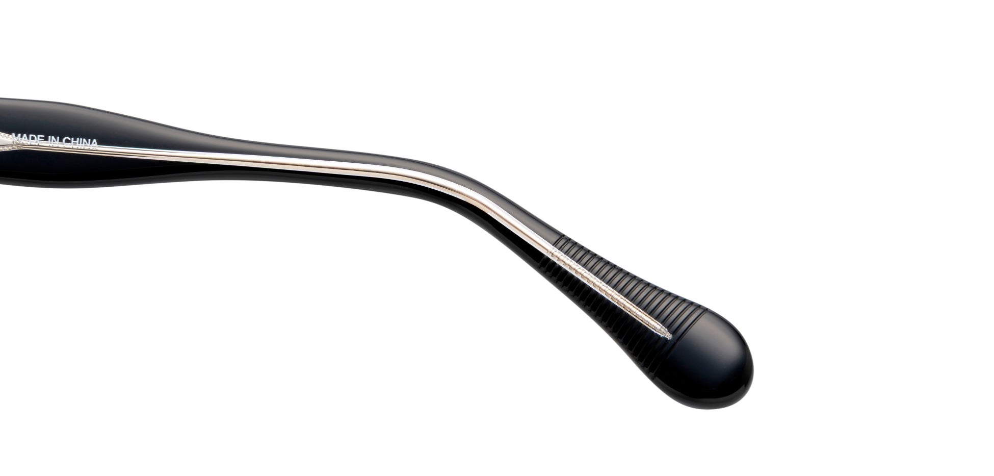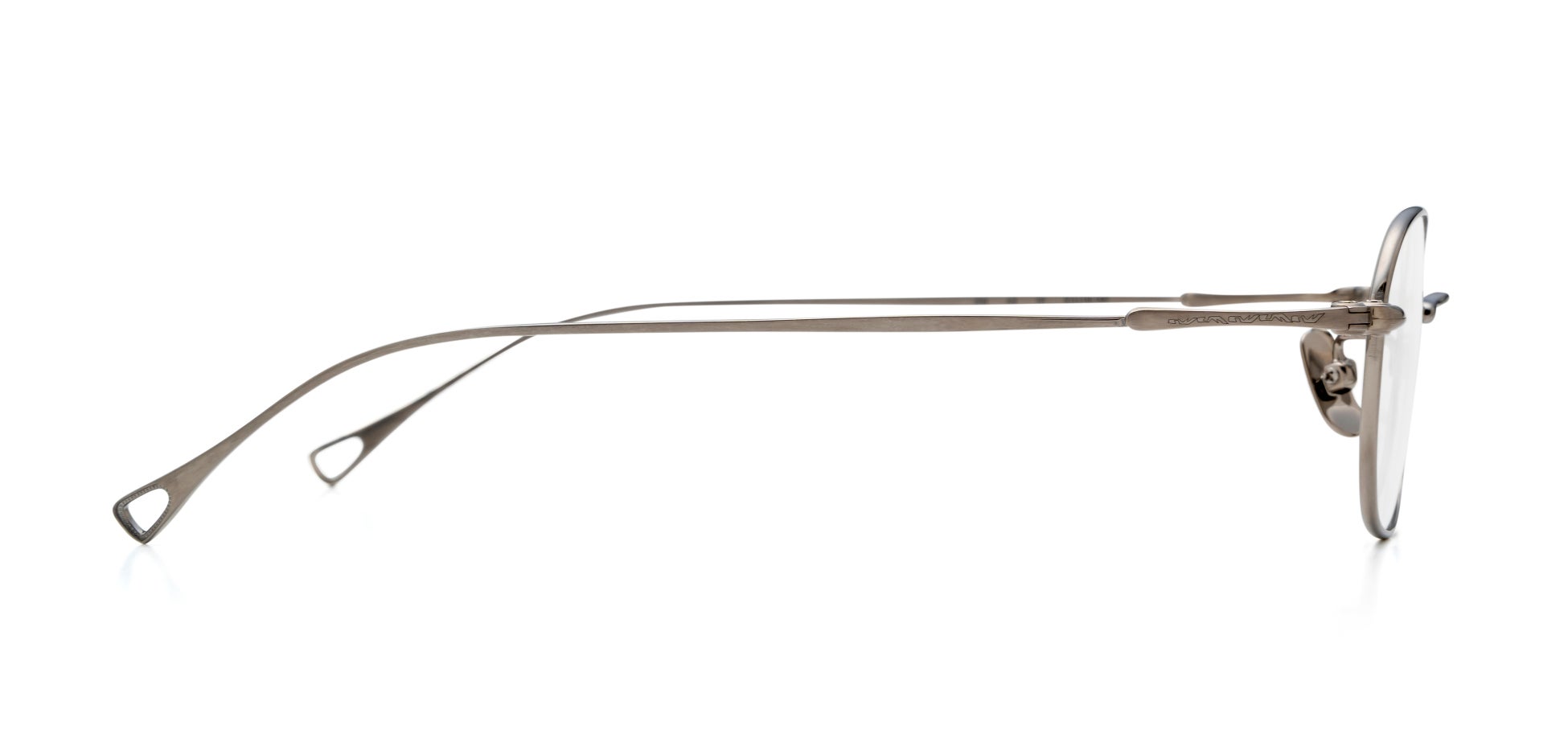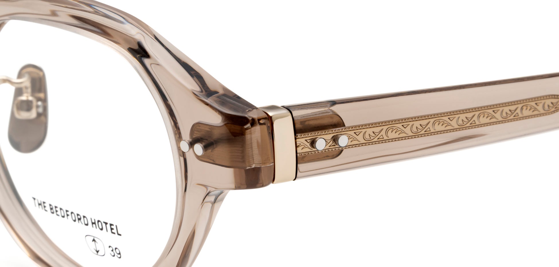 クリアなテンプルから細やかな彫金を施した金属芯が覗き、角度や光の当たり方によって表現が変化する、さりげない存在感をまとったデザインです。テンプルエンドには空洞を設けた意匠を施し、金属の質感が際立つヴィンテージな雰囲気を演出しています。