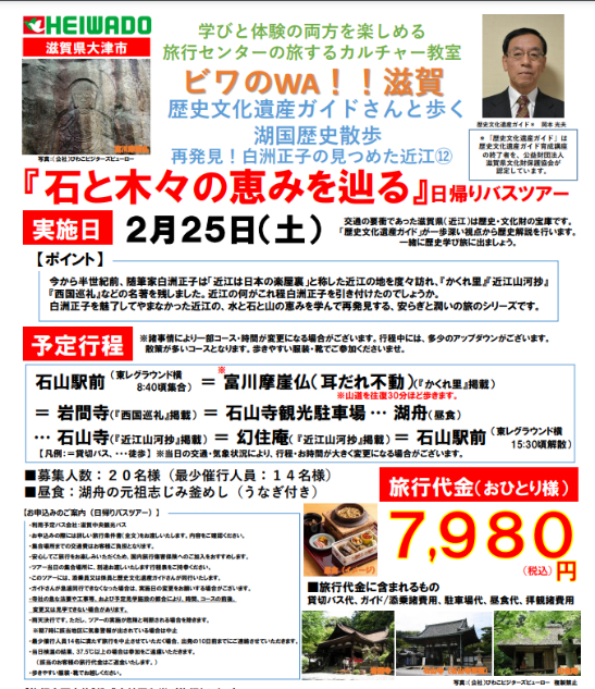 平和堂旅行センターオリジナルの旅行商品です。滋賀県の魅力をより多くの方に知っていただくため、旅するカルチャーをコンセプトに2019年12月に発売を開始しました。旅をしながら知識を学んだり技術を身に着けたり、旅を楽しみながら学びを深めていく旅です。現在は、「滋賀」「写真」をテーマに2講座を展開しています。文化財や文学の舞台になった県内の観光地を訪れるツアーや、歴史の知識を深める座学のツアーなど、様々な講座をご用意しています。「歴史文化遺産ガイド育成講座」卒業生のガイドによるツアーも人気です。
