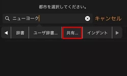 Step4:都市名を入力したら、文字の横にカーソルを当てたままタップしてメニューを表示し、「共有」を選びます。