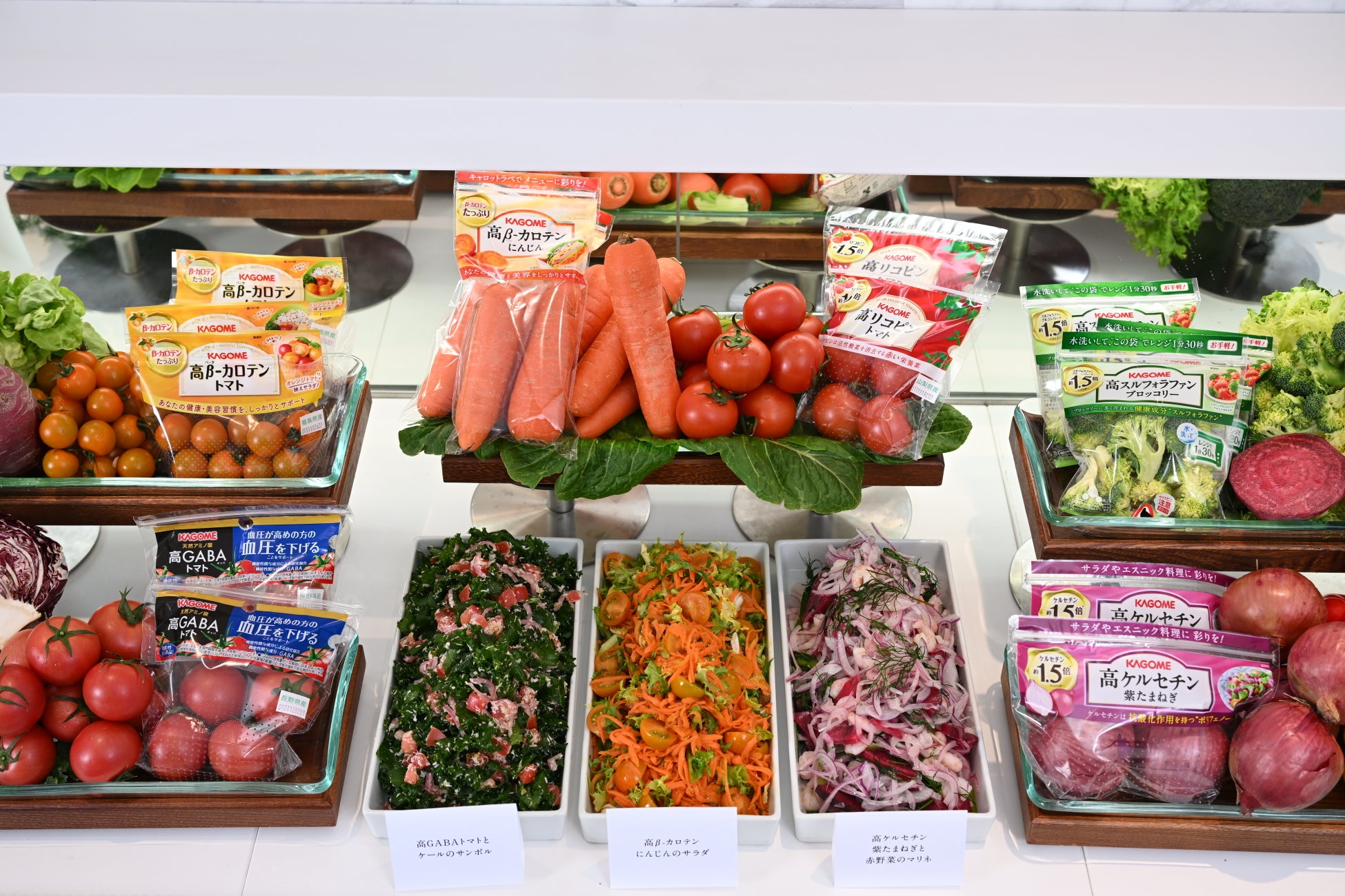 また、会見では、野菜の会社である両社が、互いのリソースを生かして今後目指していく姿を具体的にお伝えするため、カゴメの担当者による野菜の研究や野菜の上手な摂り方についての講演、ロック・フィールドの担当者から、協業をイメージしたメニュー開発のお話をし、メニューの展示、試食を行いました。