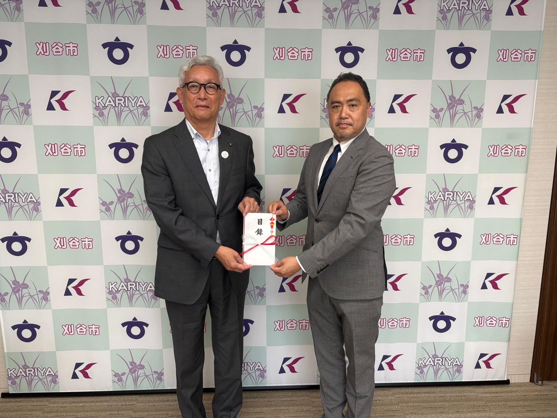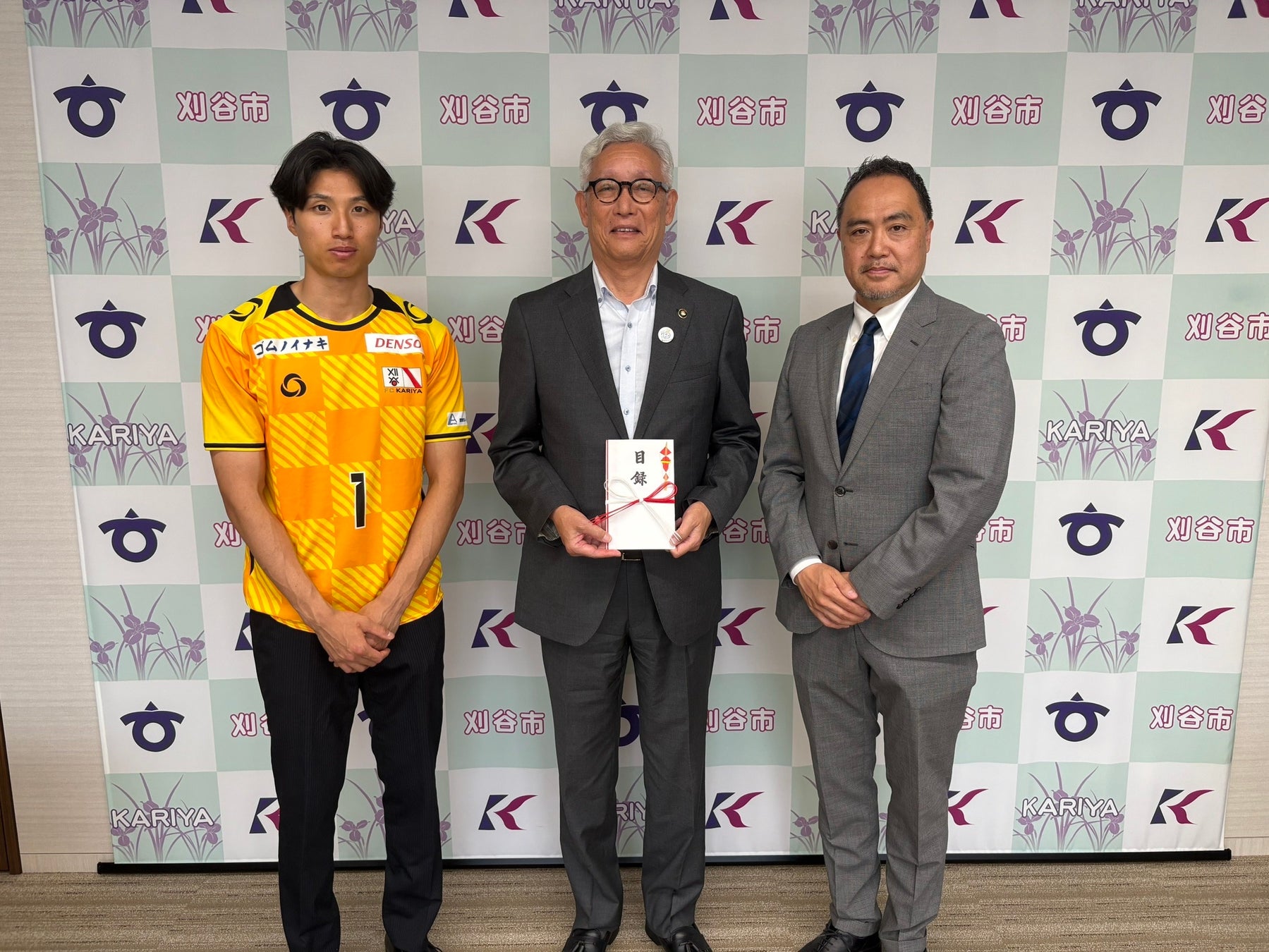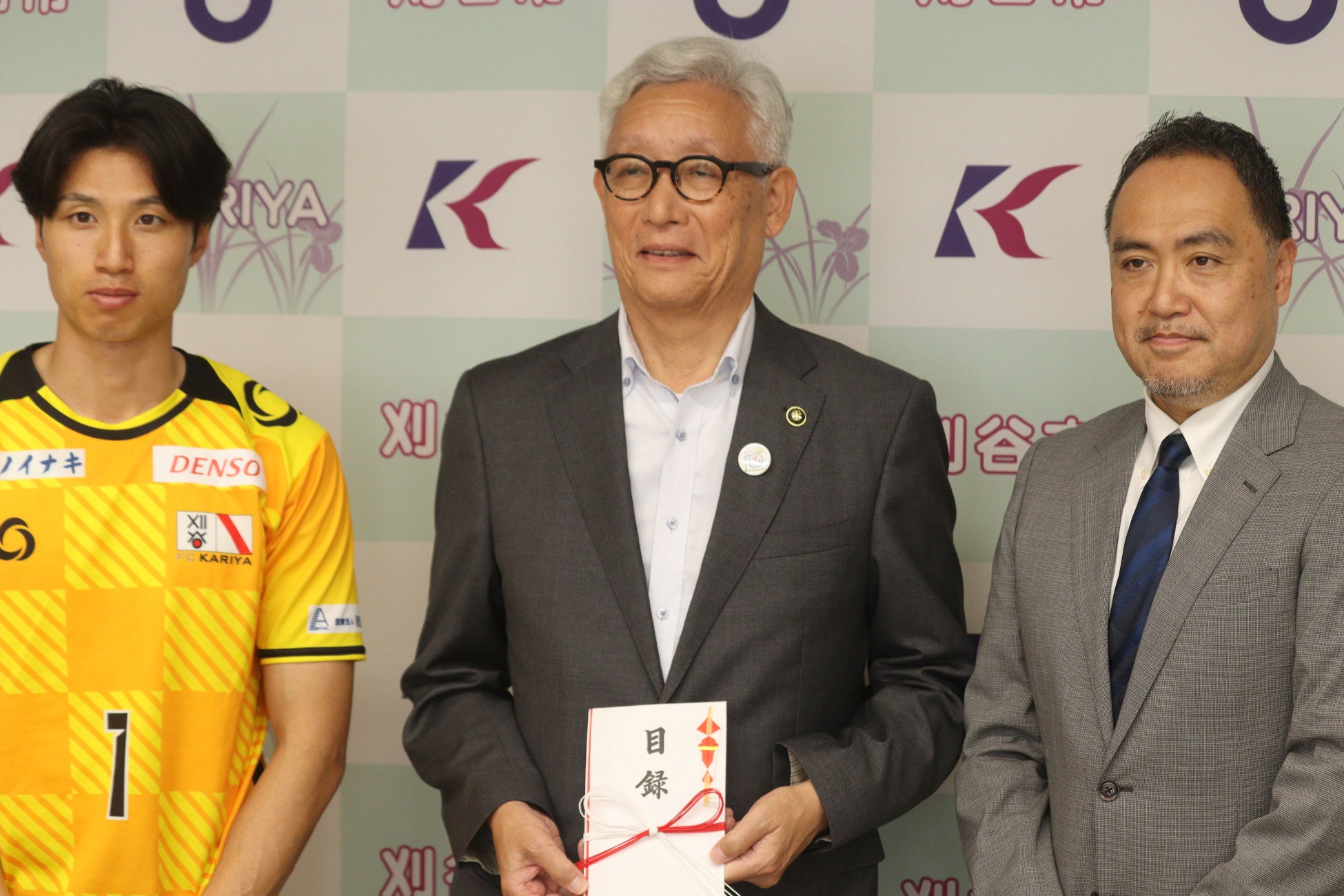 寄贈式には、当クラブより佐々木賢二代表取締役社長、山本伊織選手が出席し、稲垣武刈谷市長へランドセルの目録を贈呈しました。