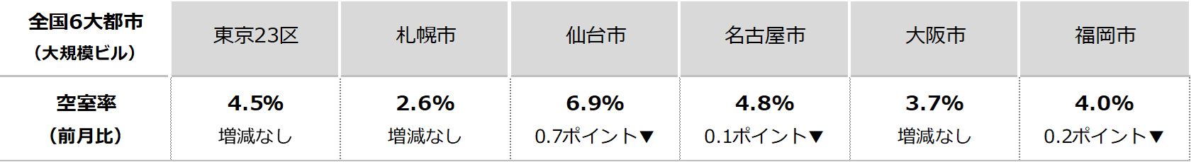 三幸エステート株式会社(本社:東京都中央区、取締役社長:武井重夫)は、2024年4月度の東京都心5区(千代田区、中央区、港区、新宿区、渋谷区)および全国6大都市(東京、札幌、仙台、名古屋、大阪、福岡)の大規模ビル※1のマーケットデータをまとめた「オフィスマーケット2024年5月号」を公表します。